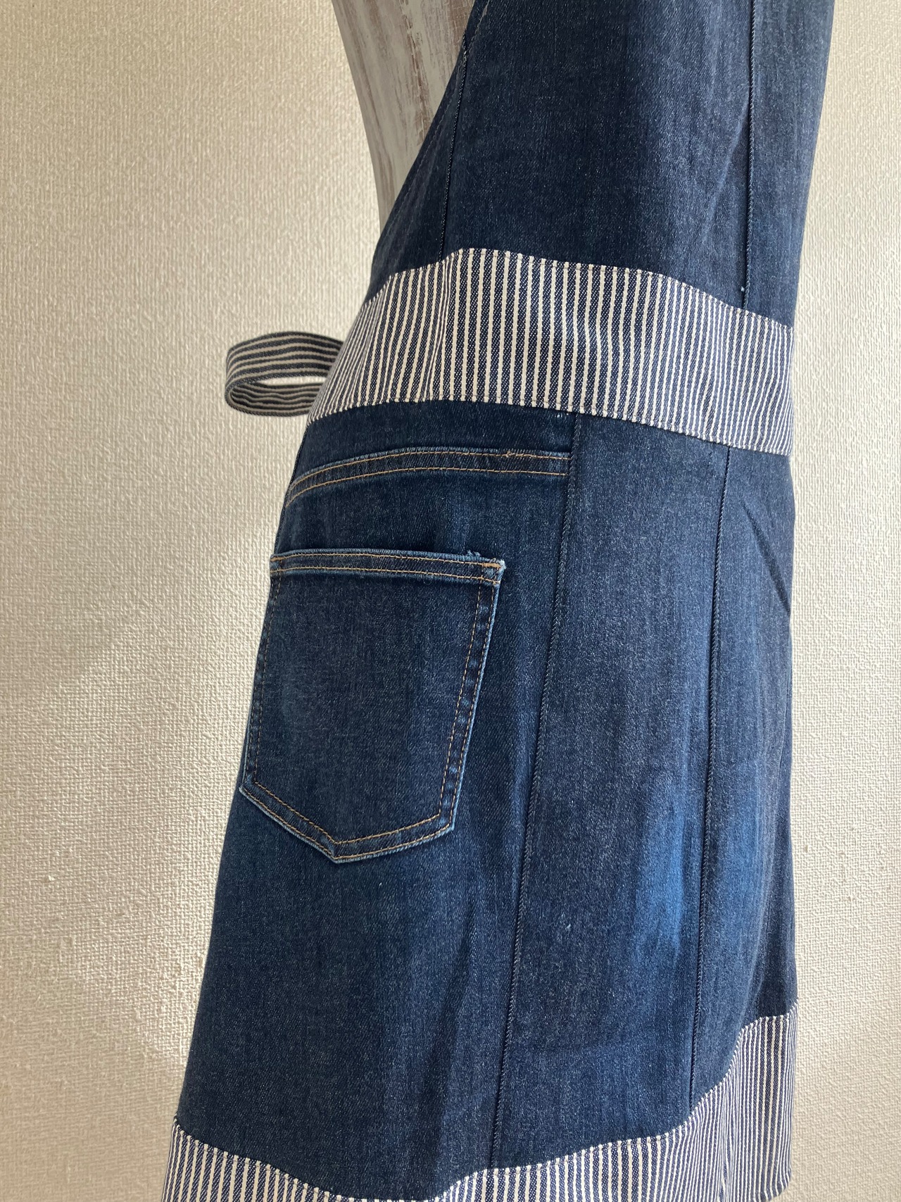 濃いめのデニムとヒッコリー柄。