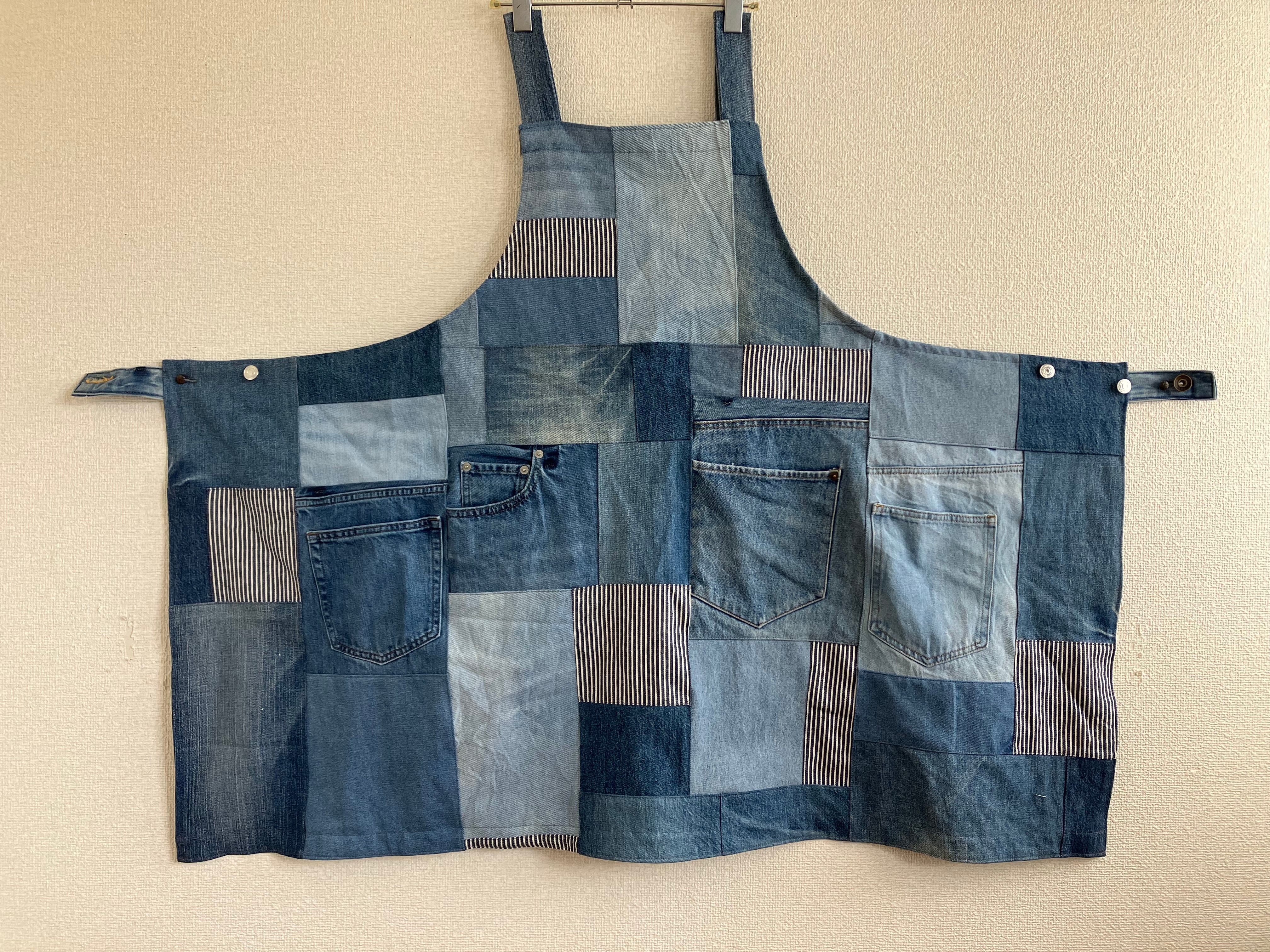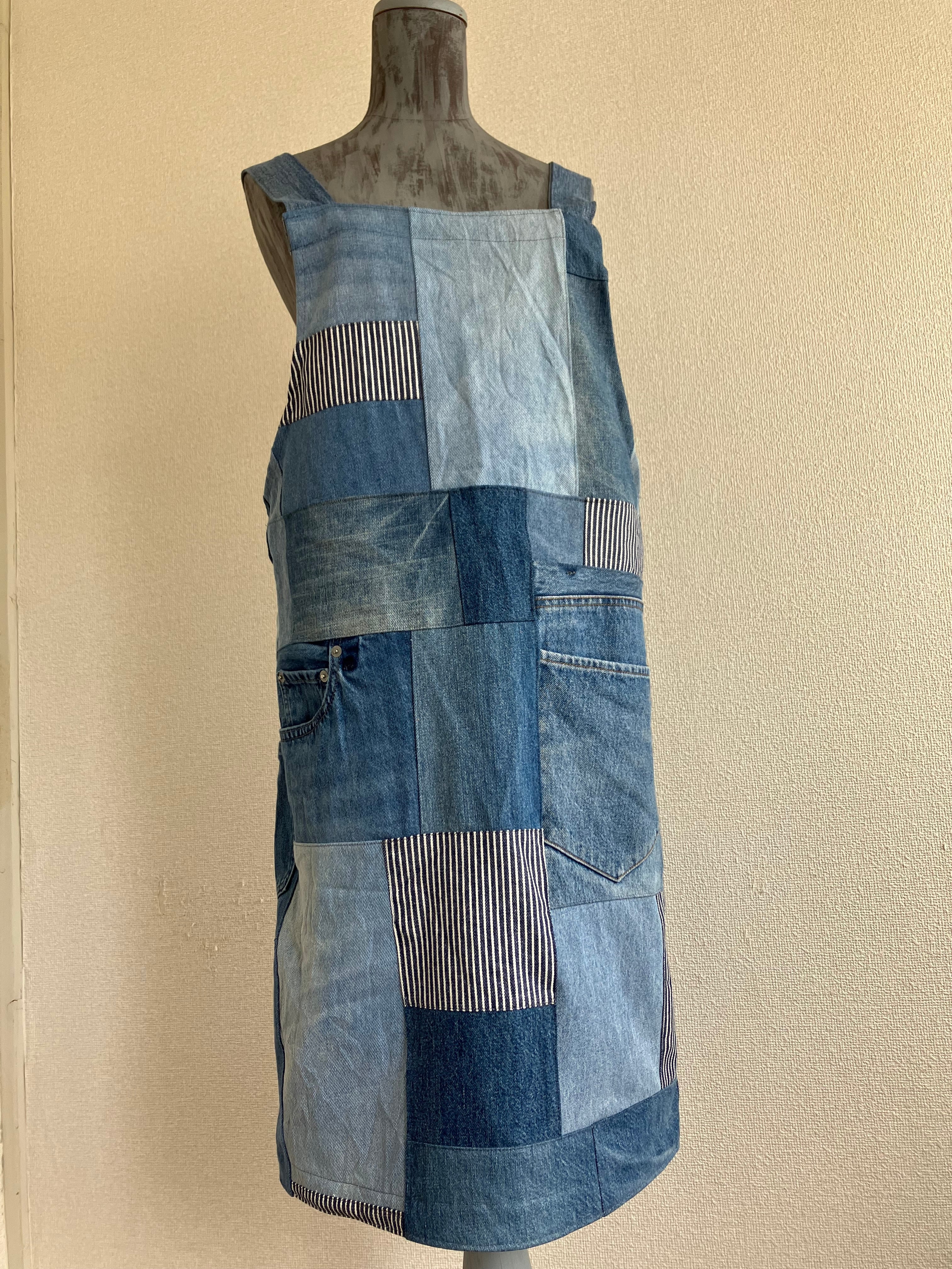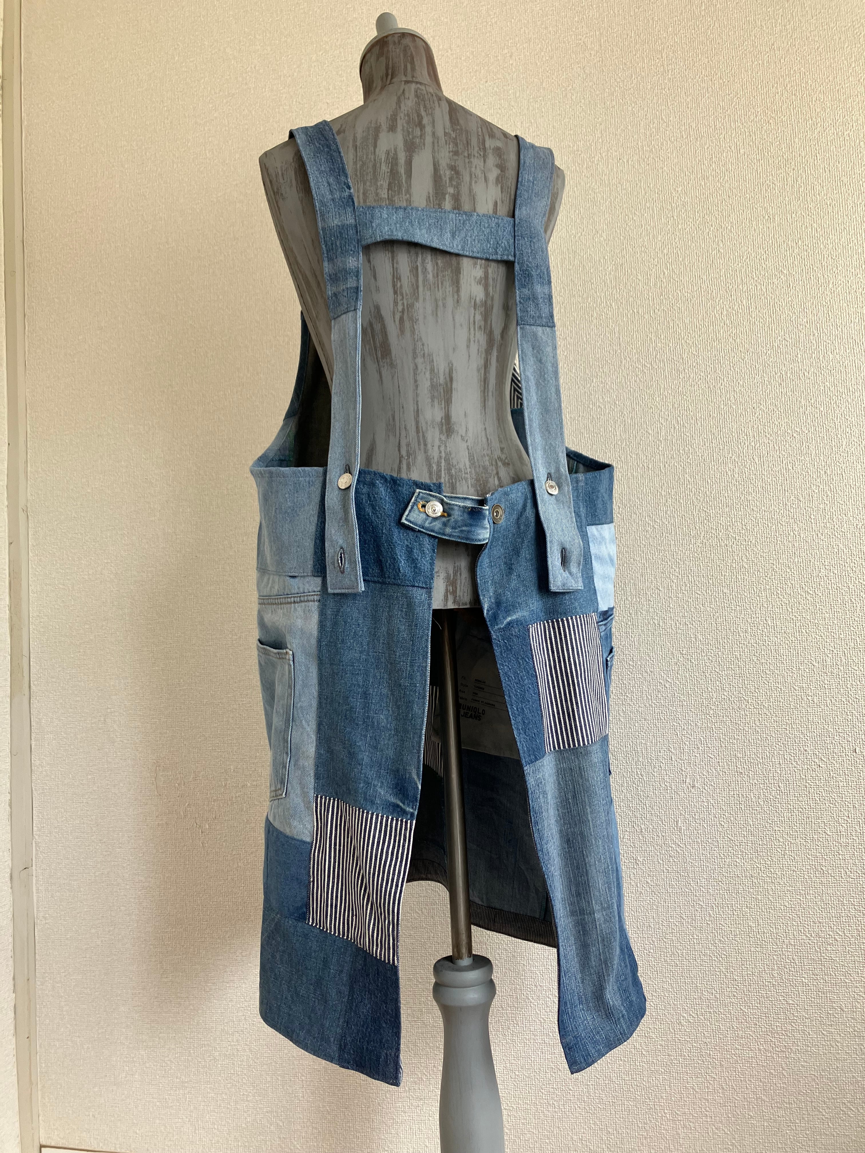 パッチワークエプロン うすめブルー×ヒッコリー②