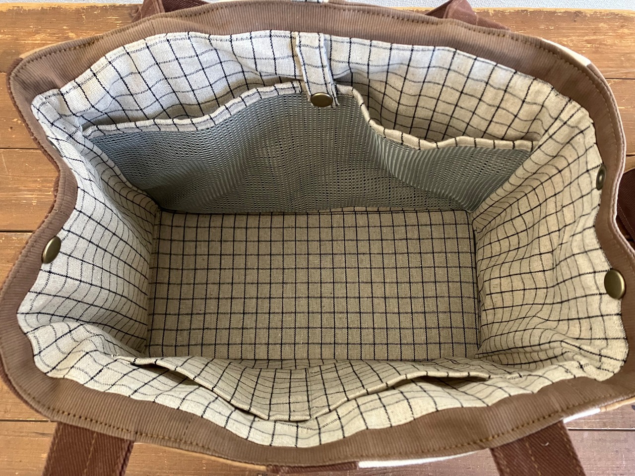 内側にはメッシュの大きなポケット、小分け用のポケットが付いていて使いやすさ抜群です。