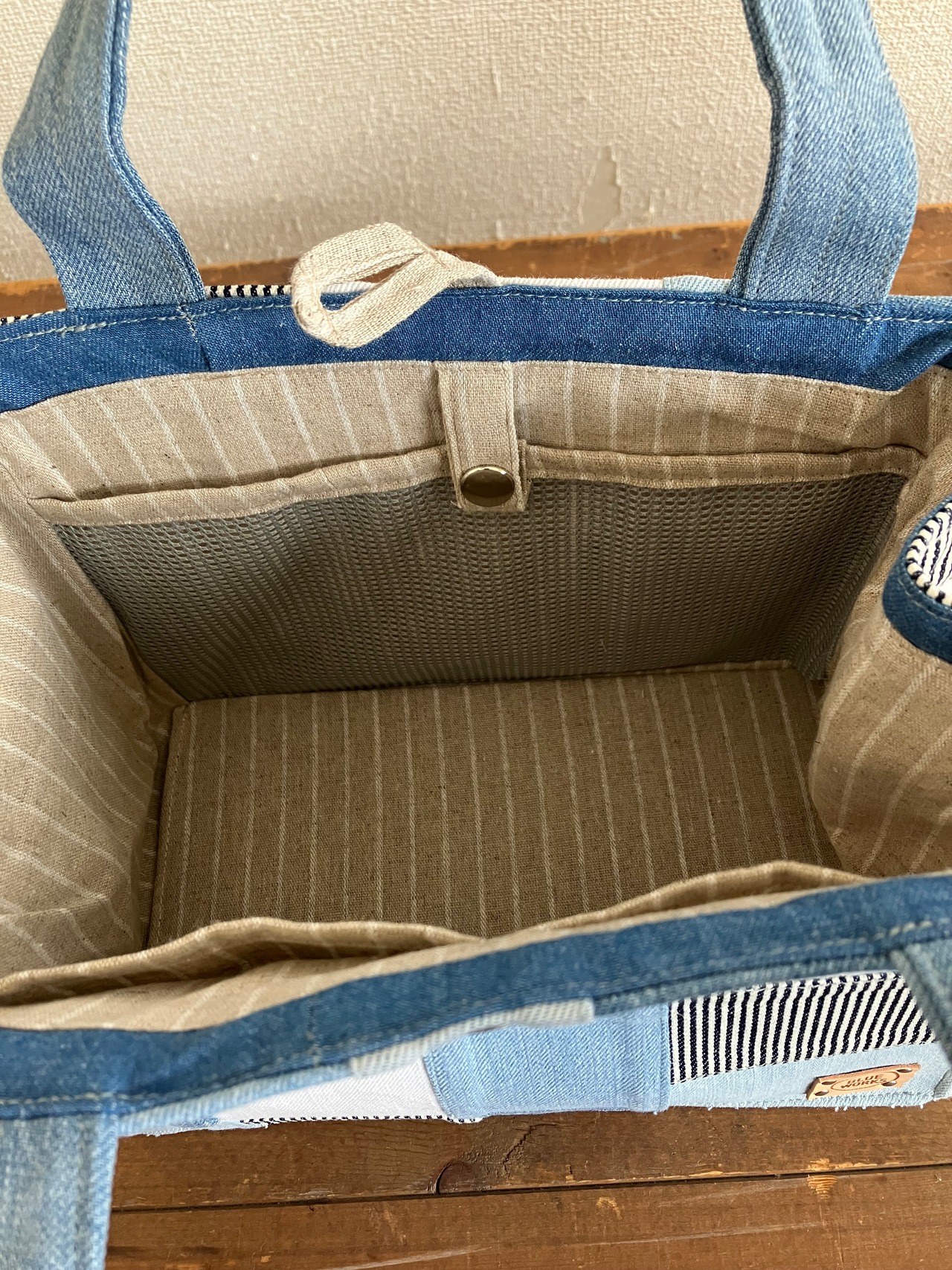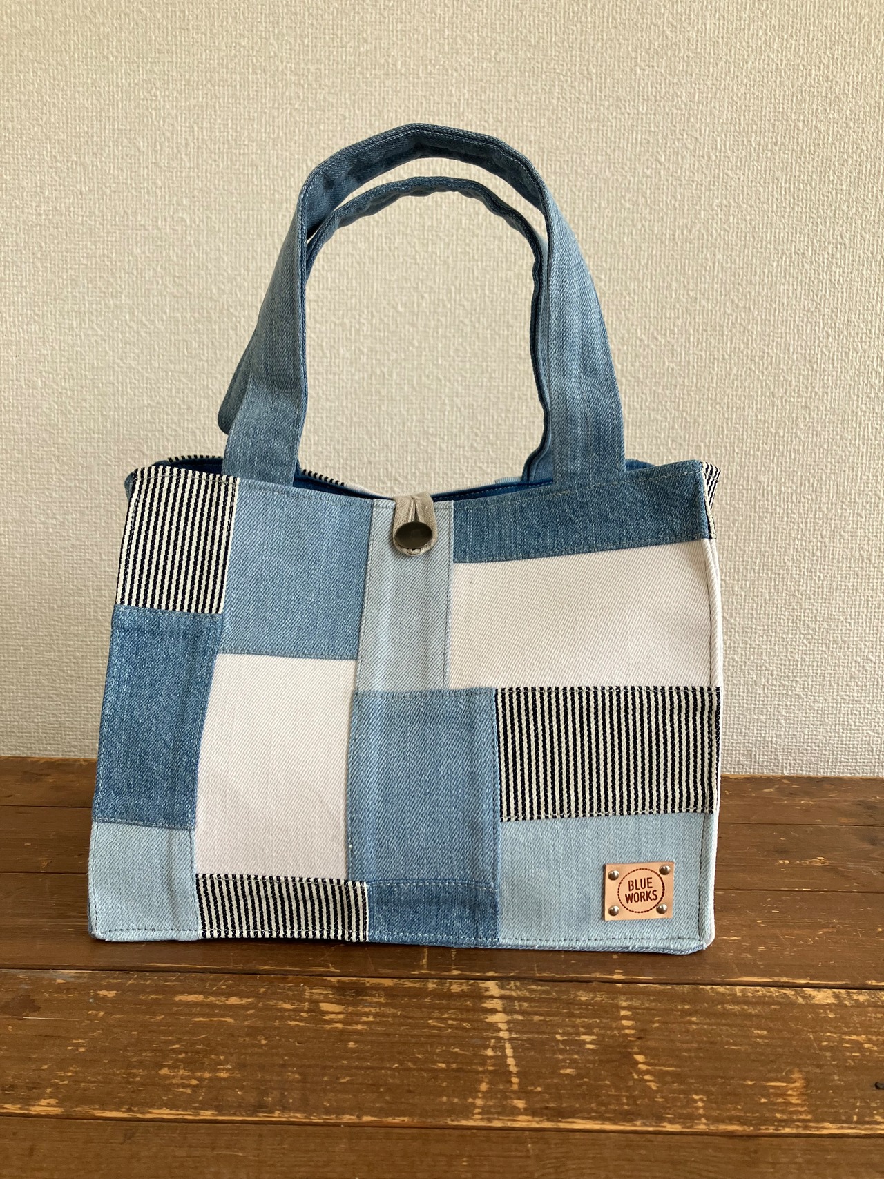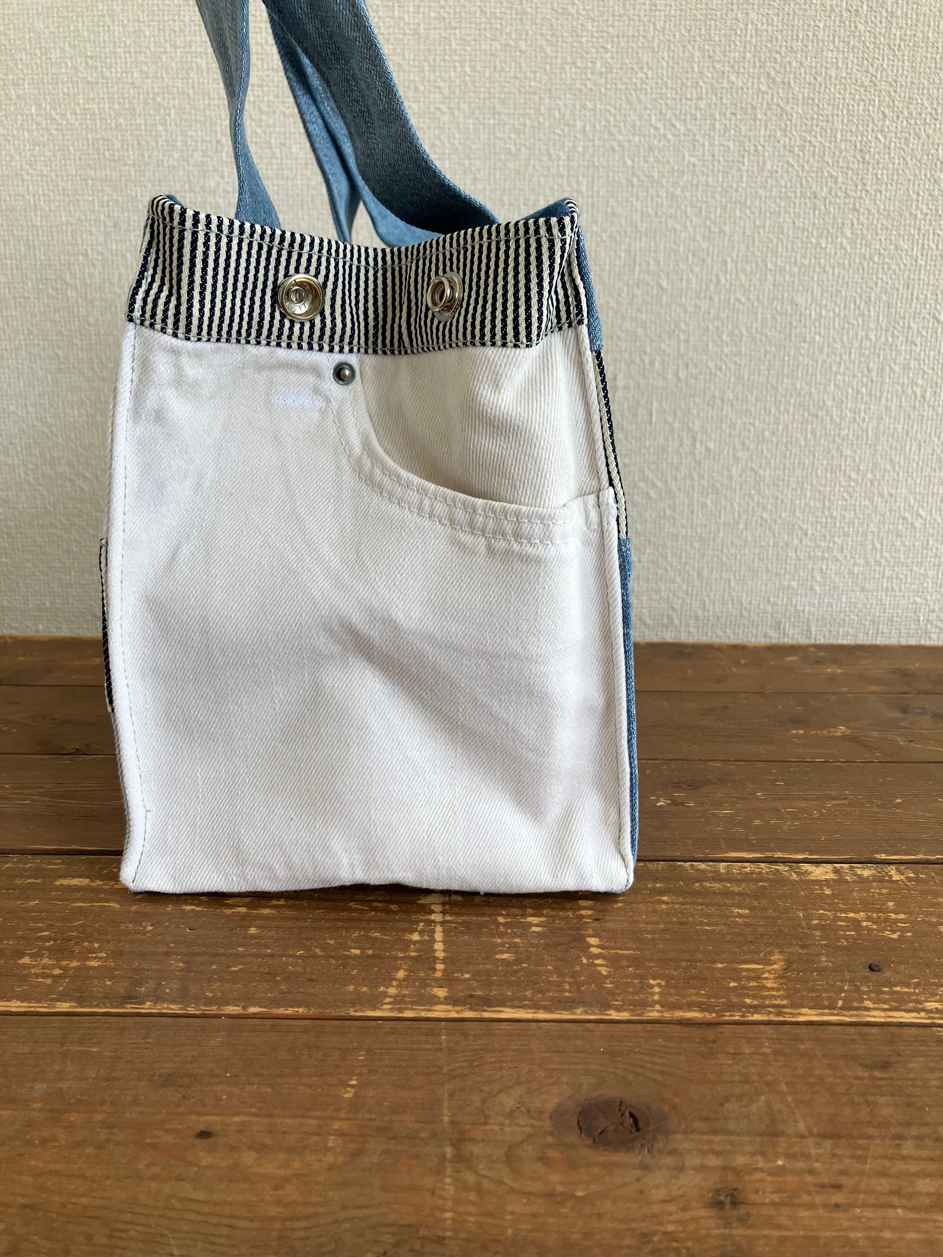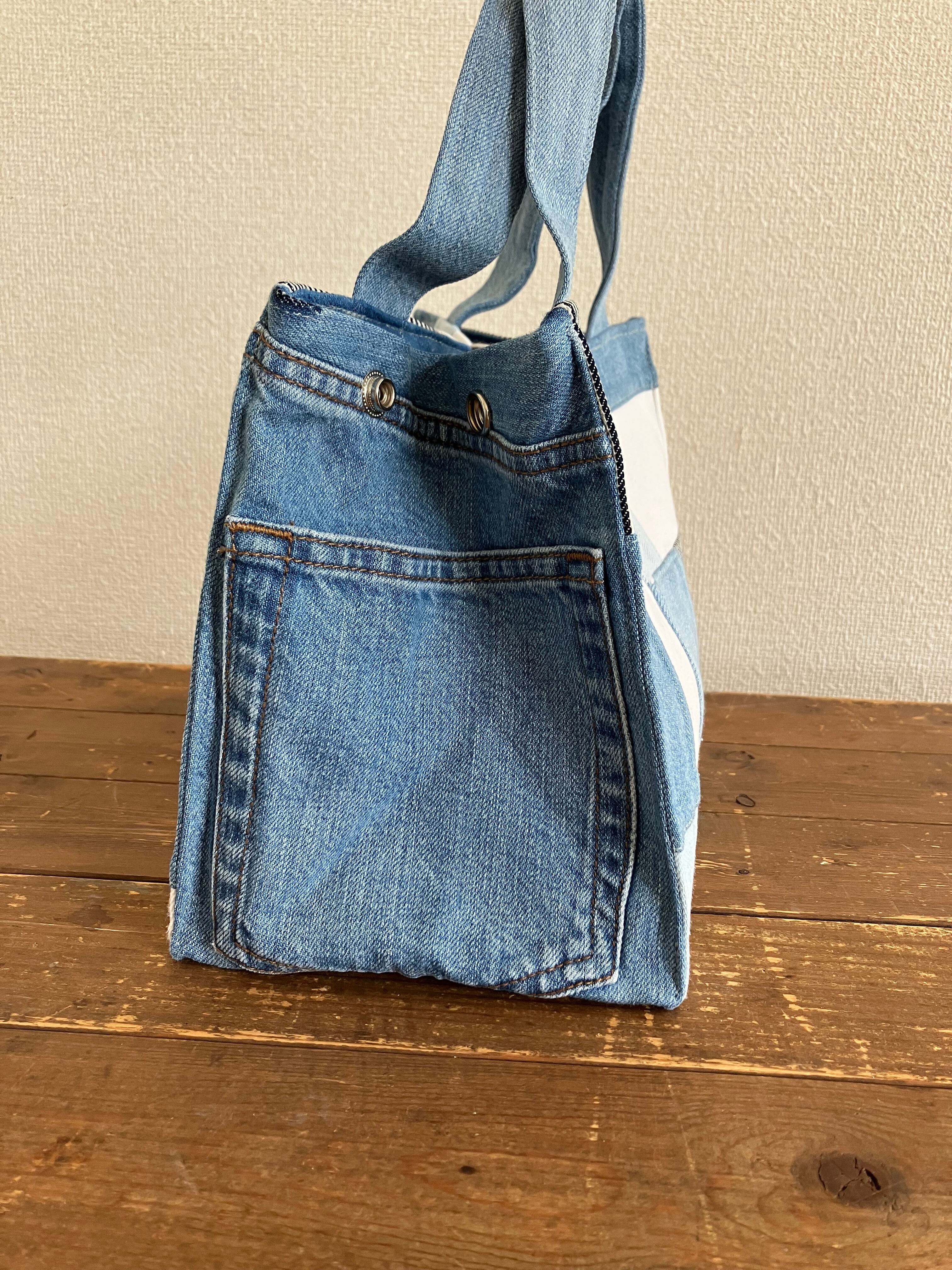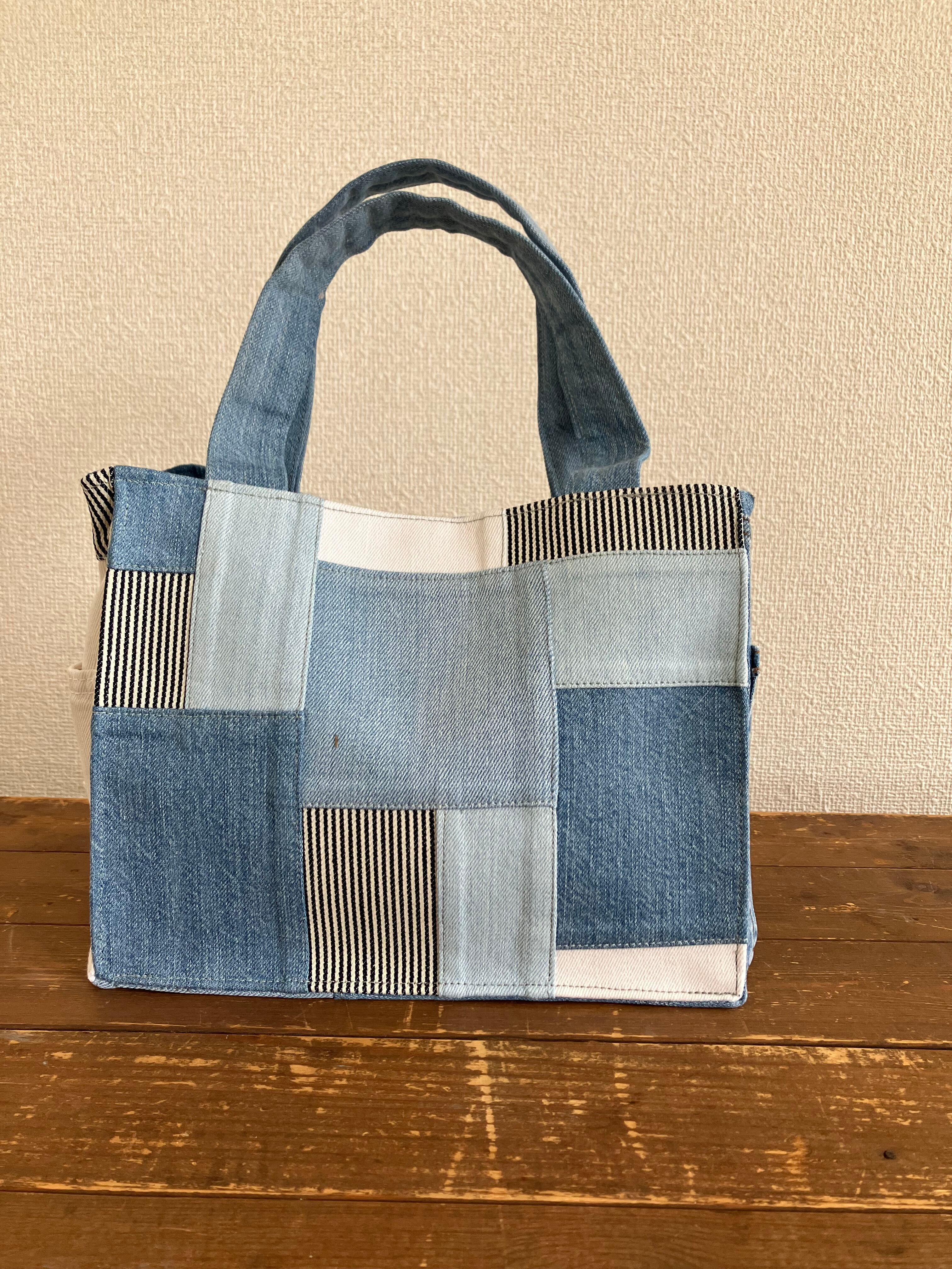 古着のデニムをパッチワークで繋ぎバッグに仕立てています。