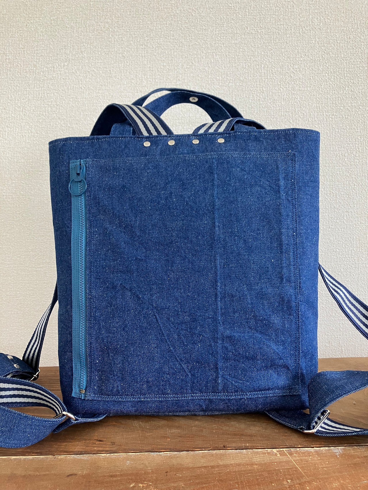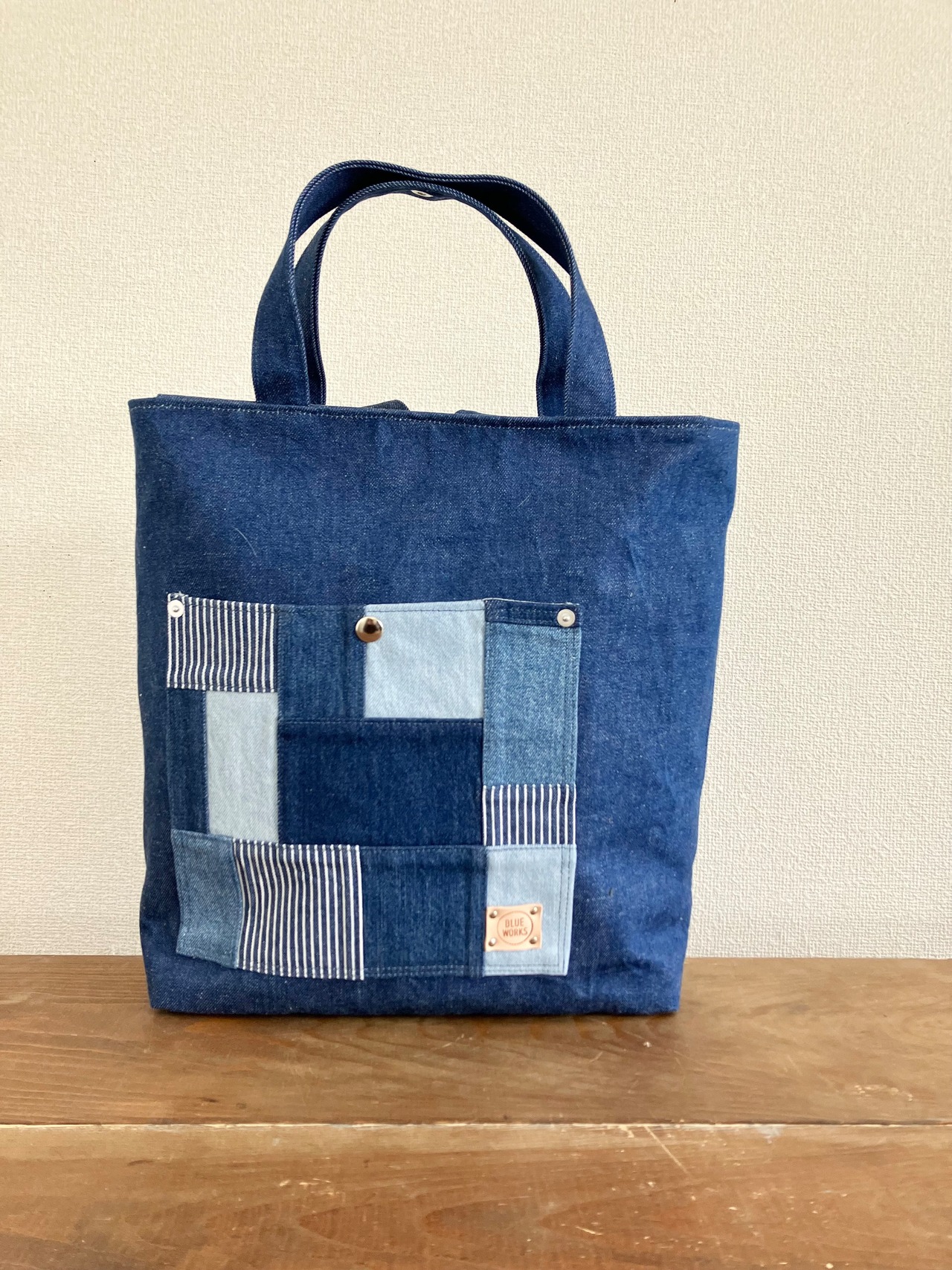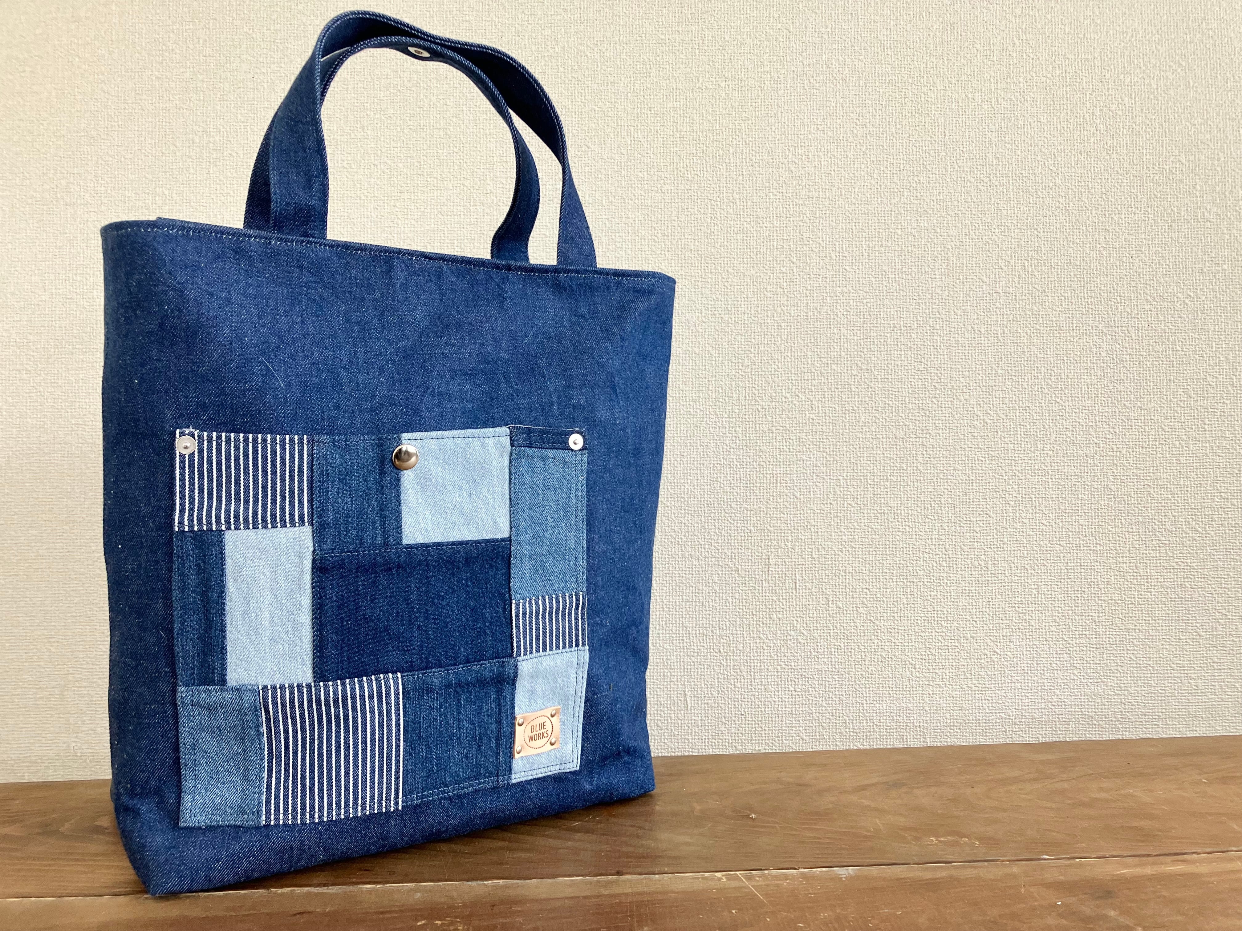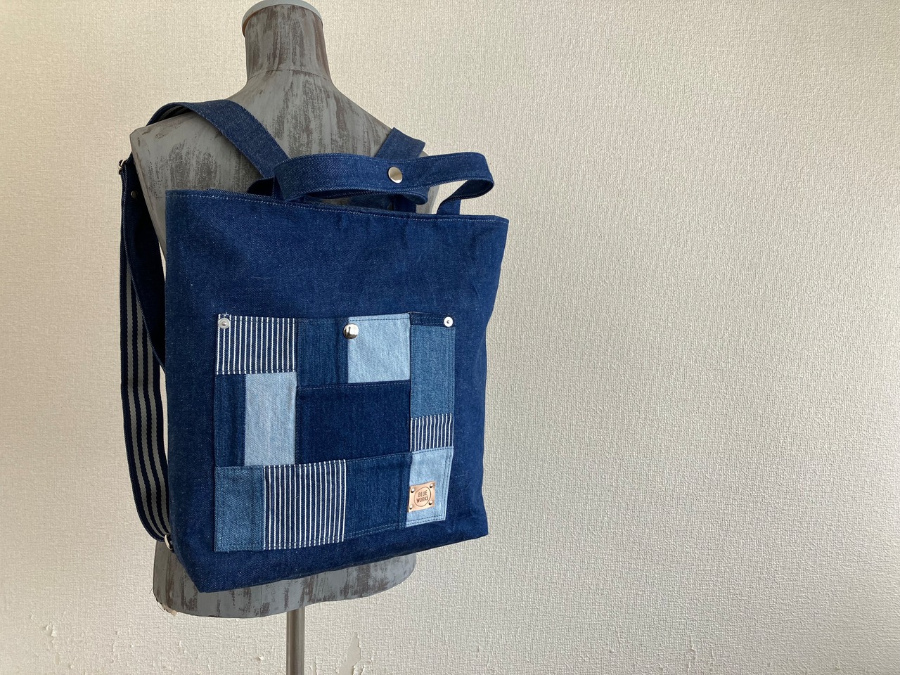 パッチワークは明るめのブルー。リュック本体はスタンダードなブルーです。
