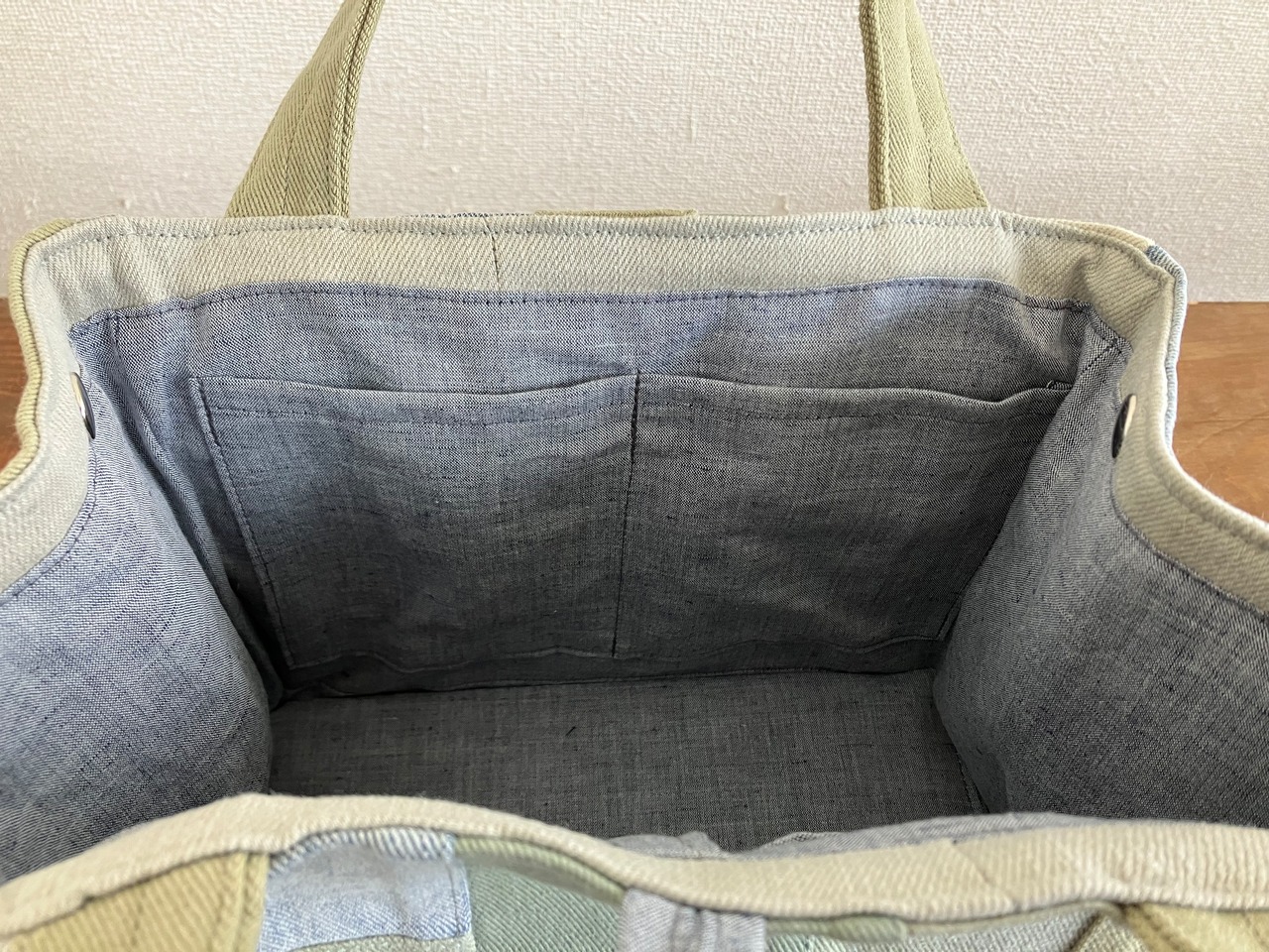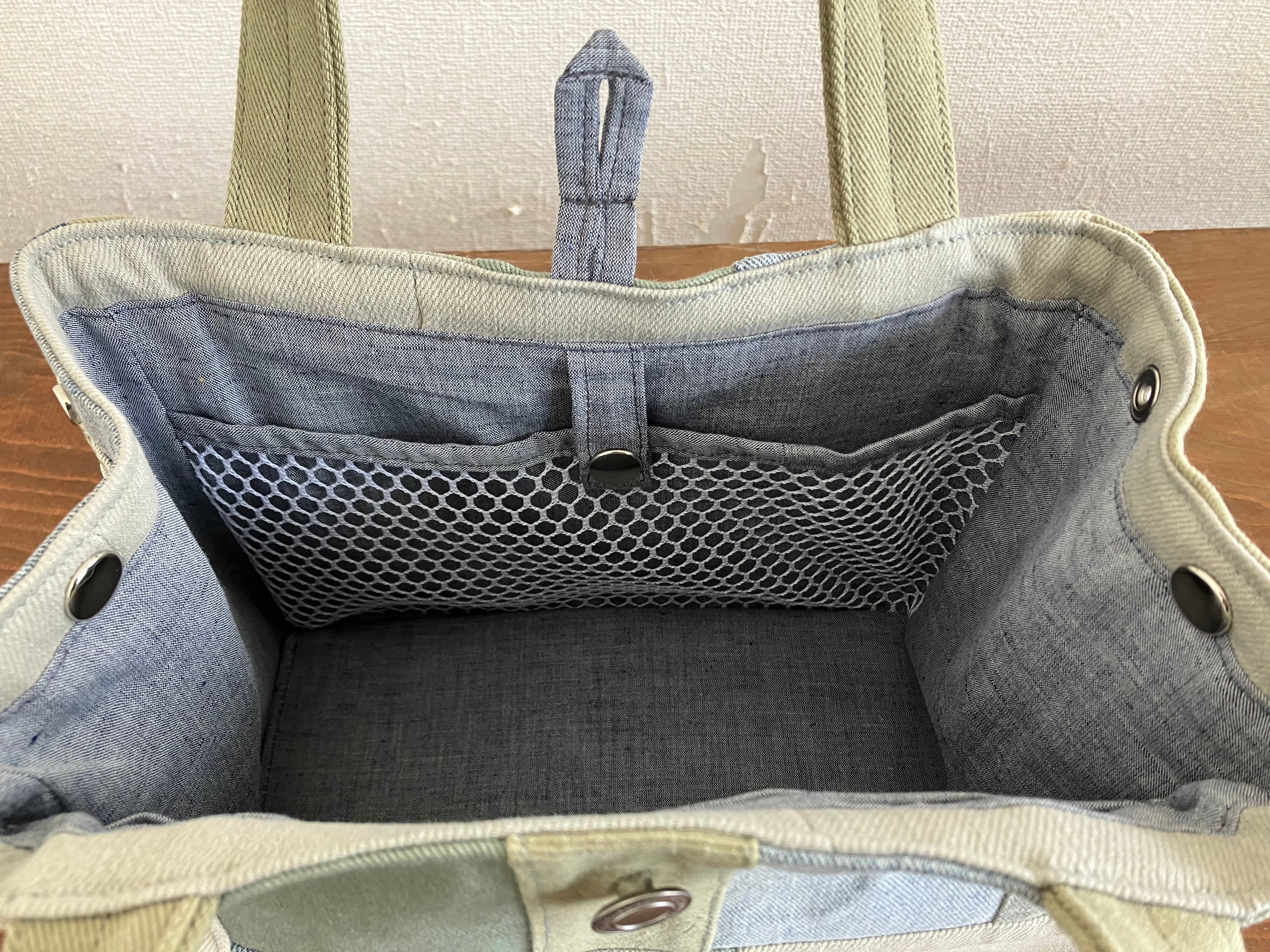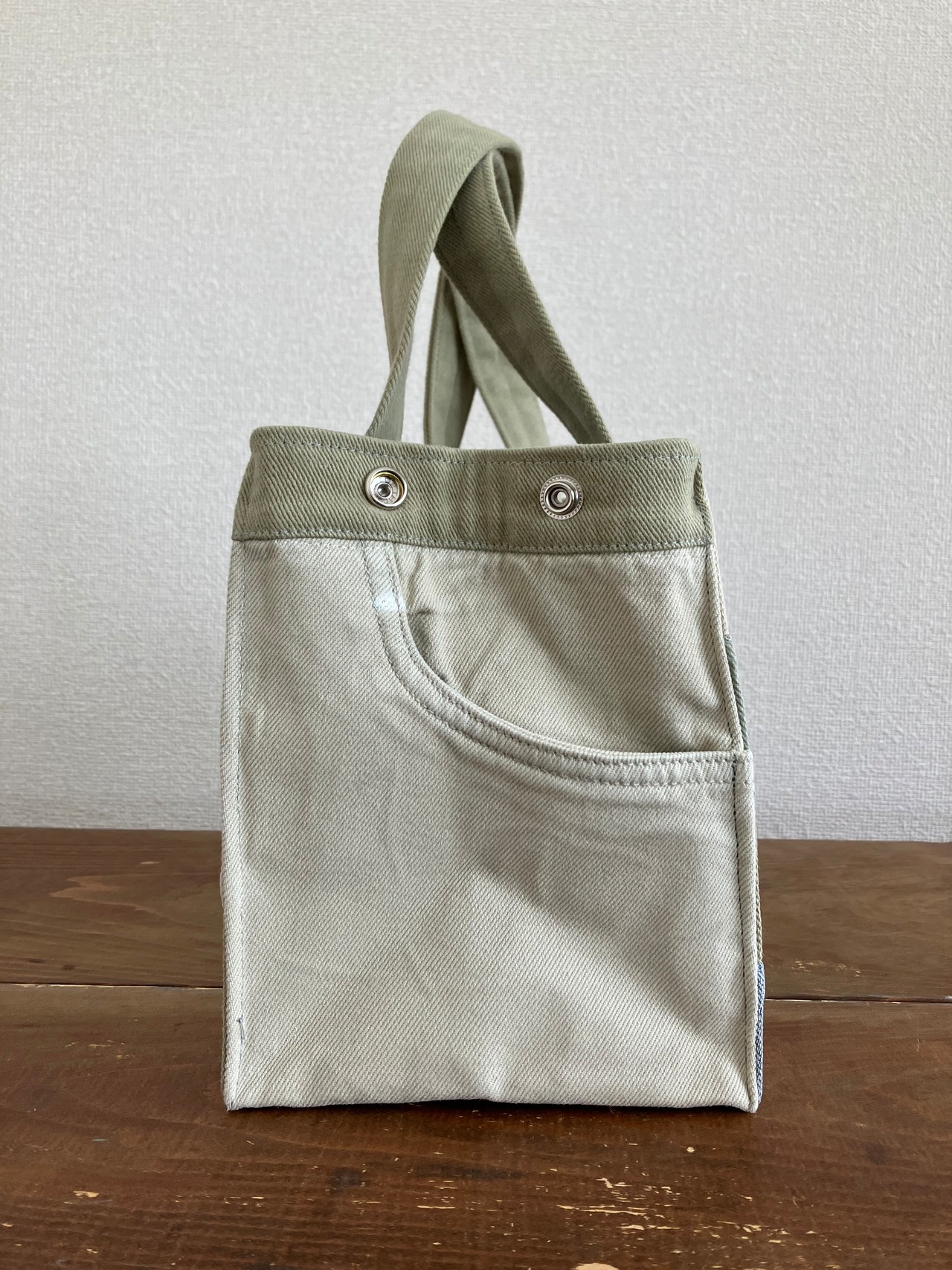 BLUEWORKSのトートバッグはサイドにジーンズのポケットが付いています。