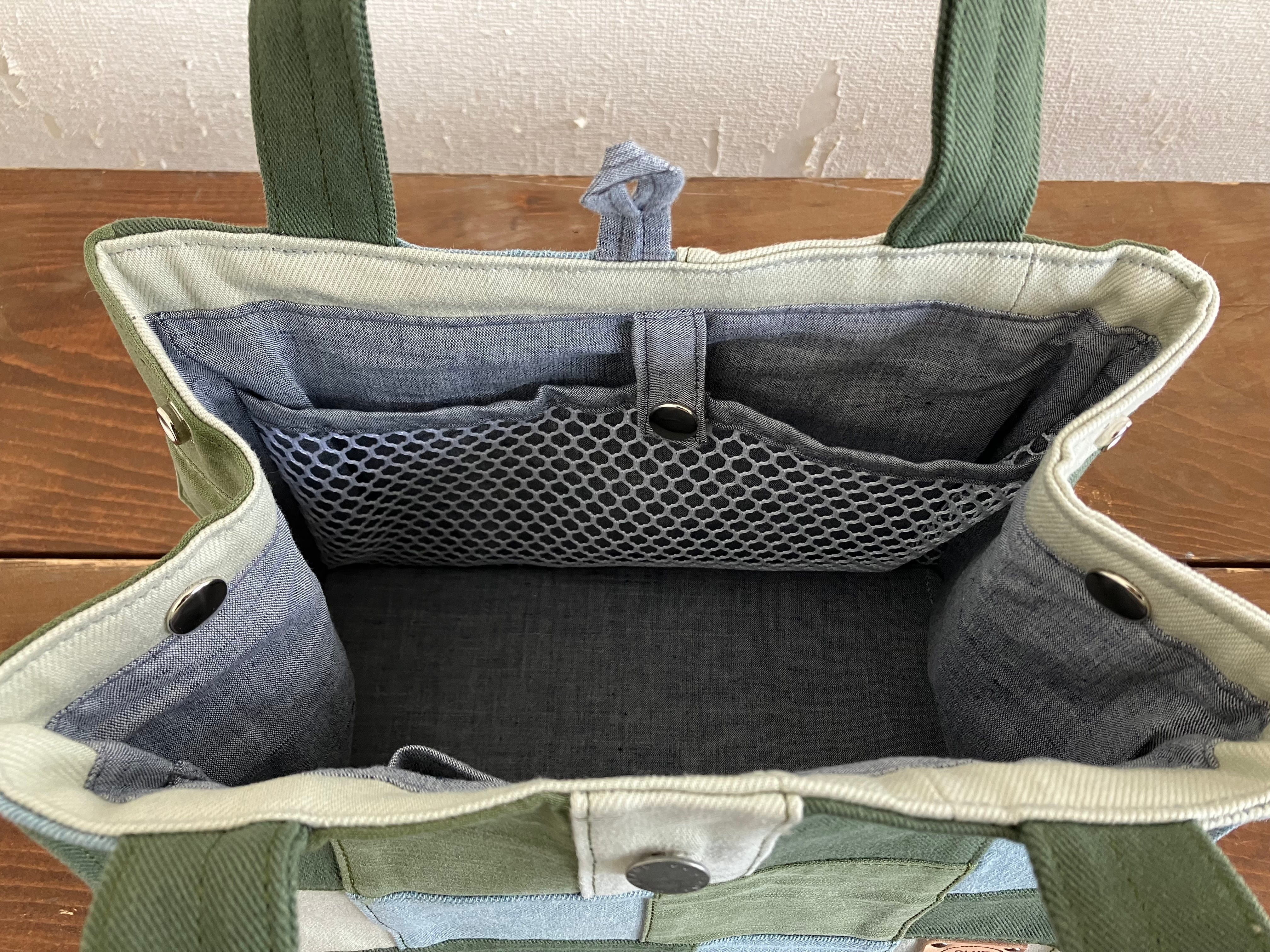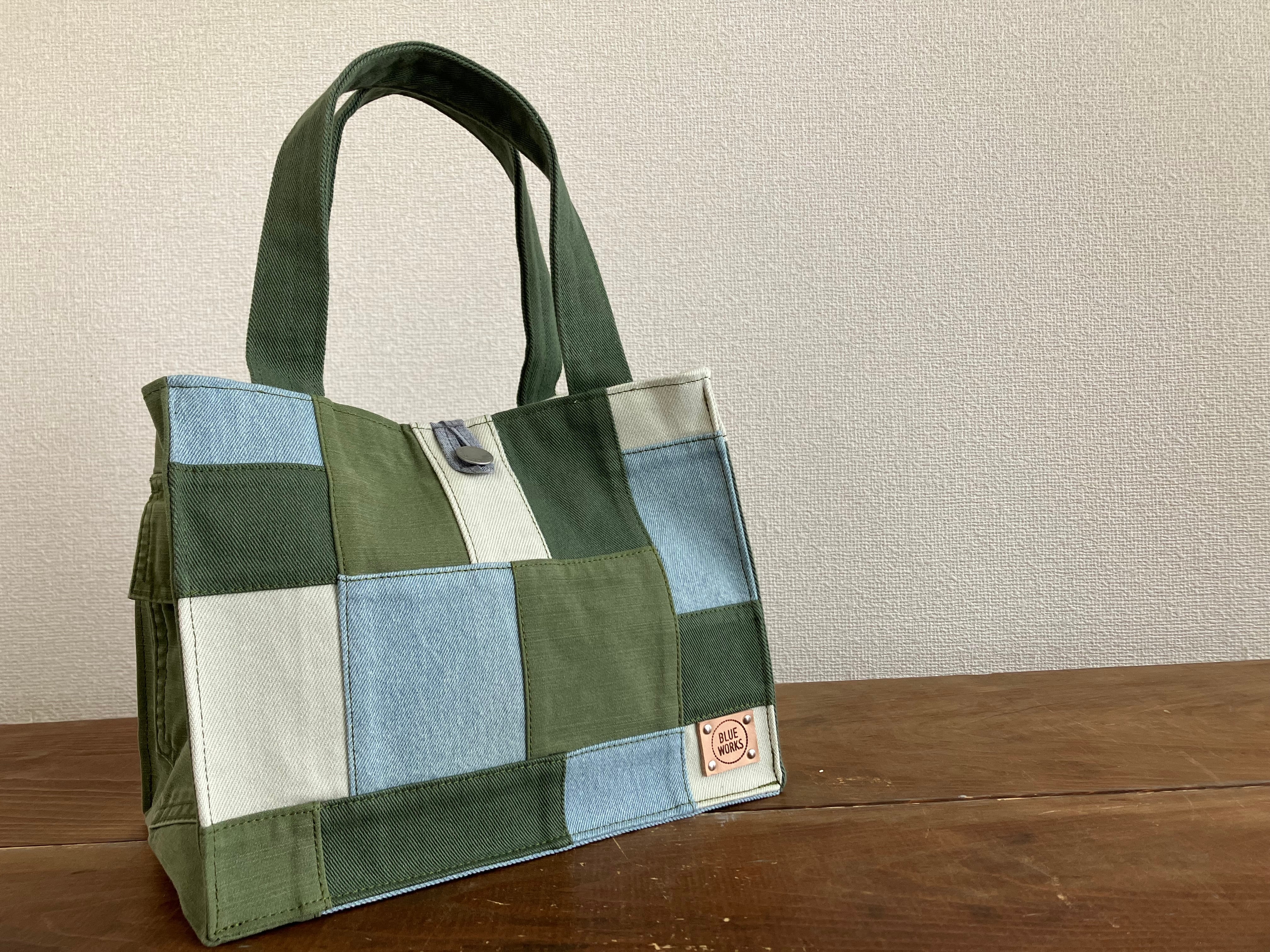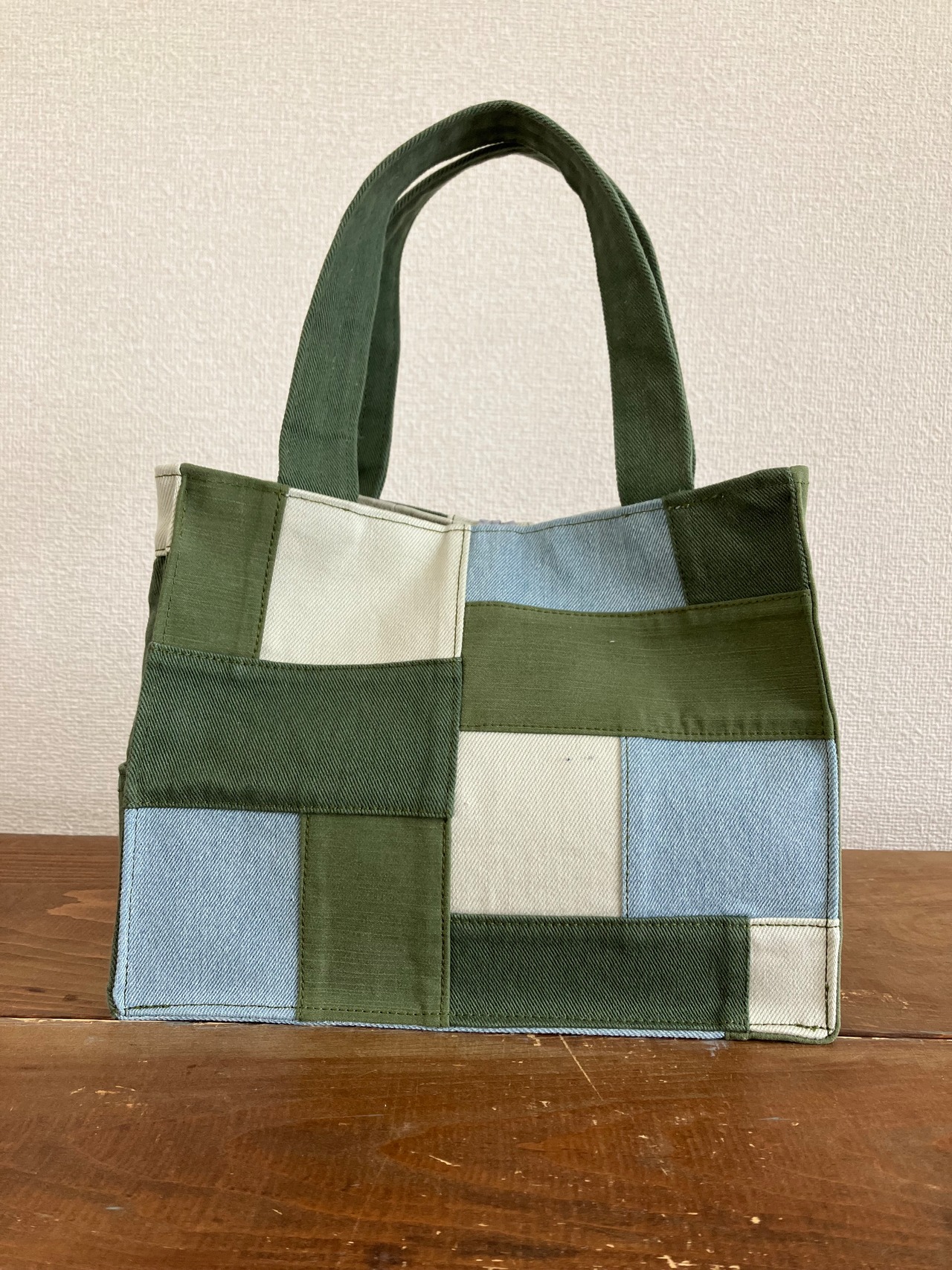 古着のデニムをパッチワークで繋ぎバッグに仕立てています。