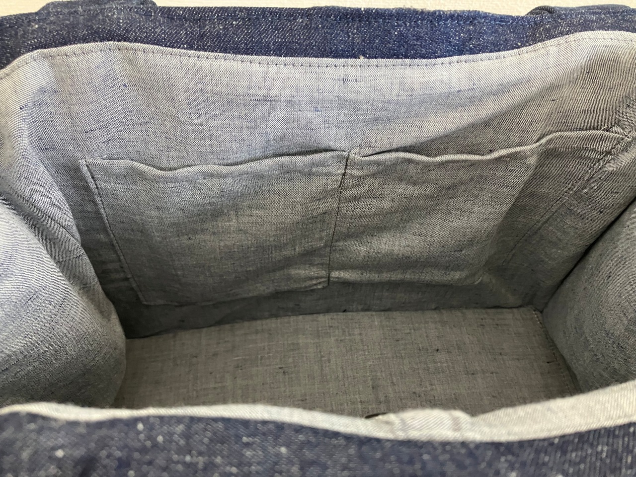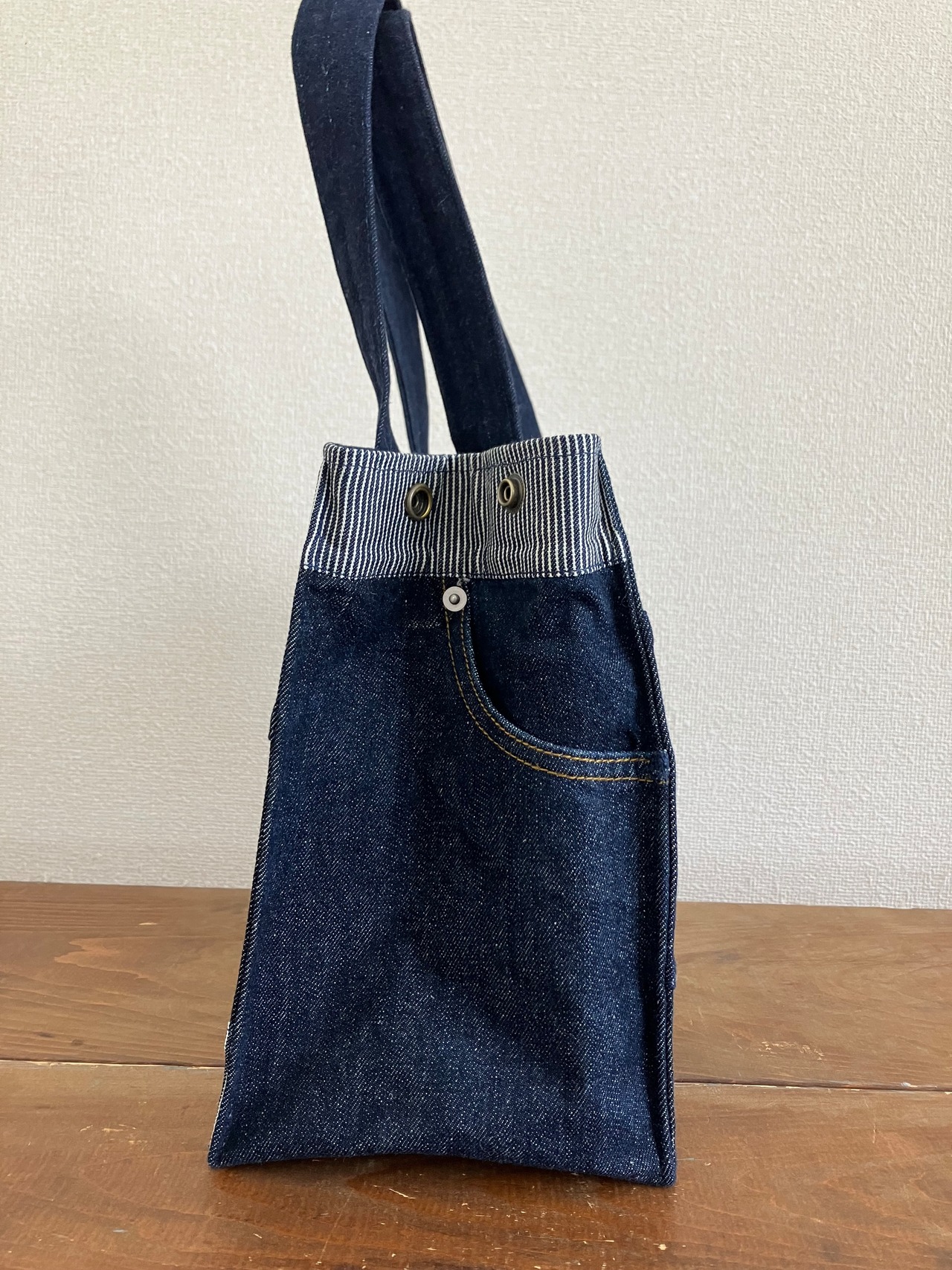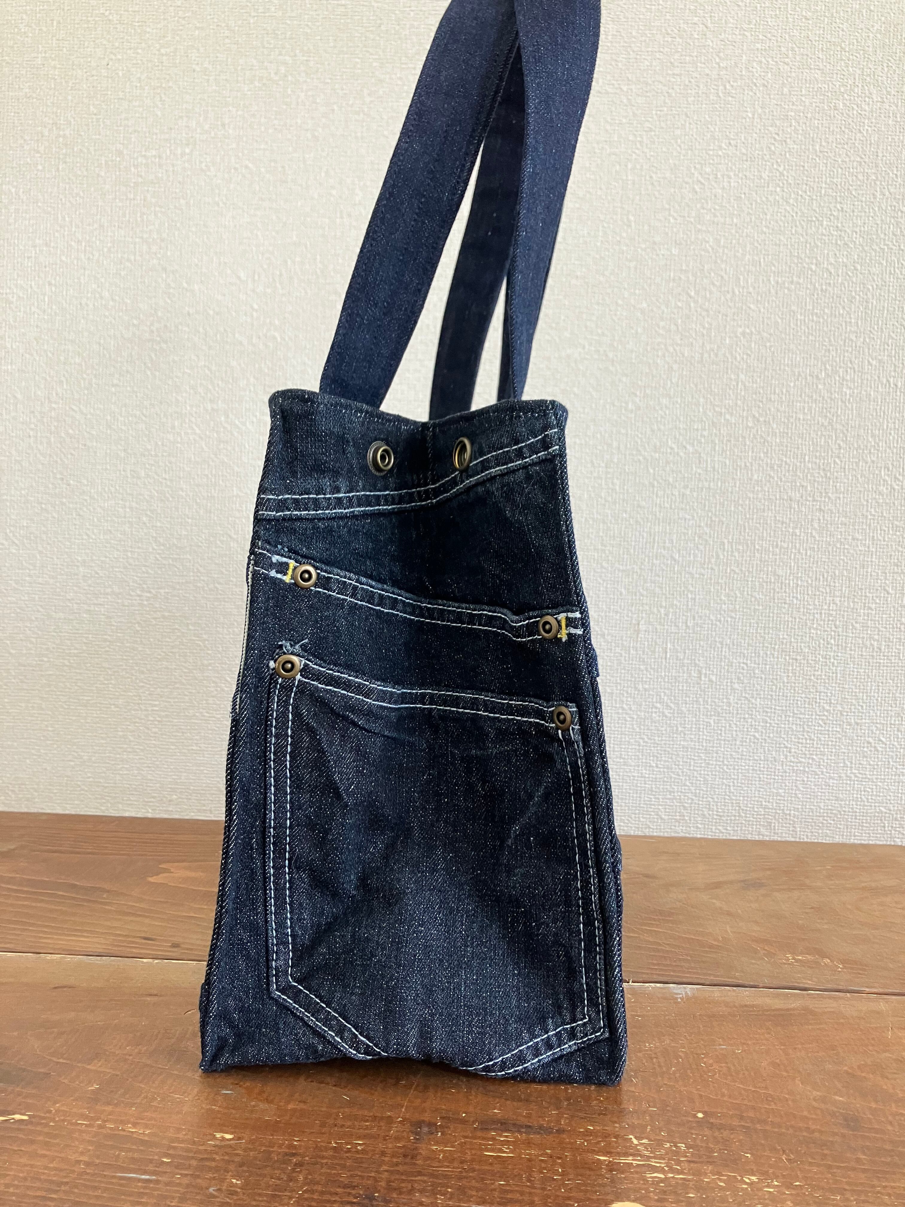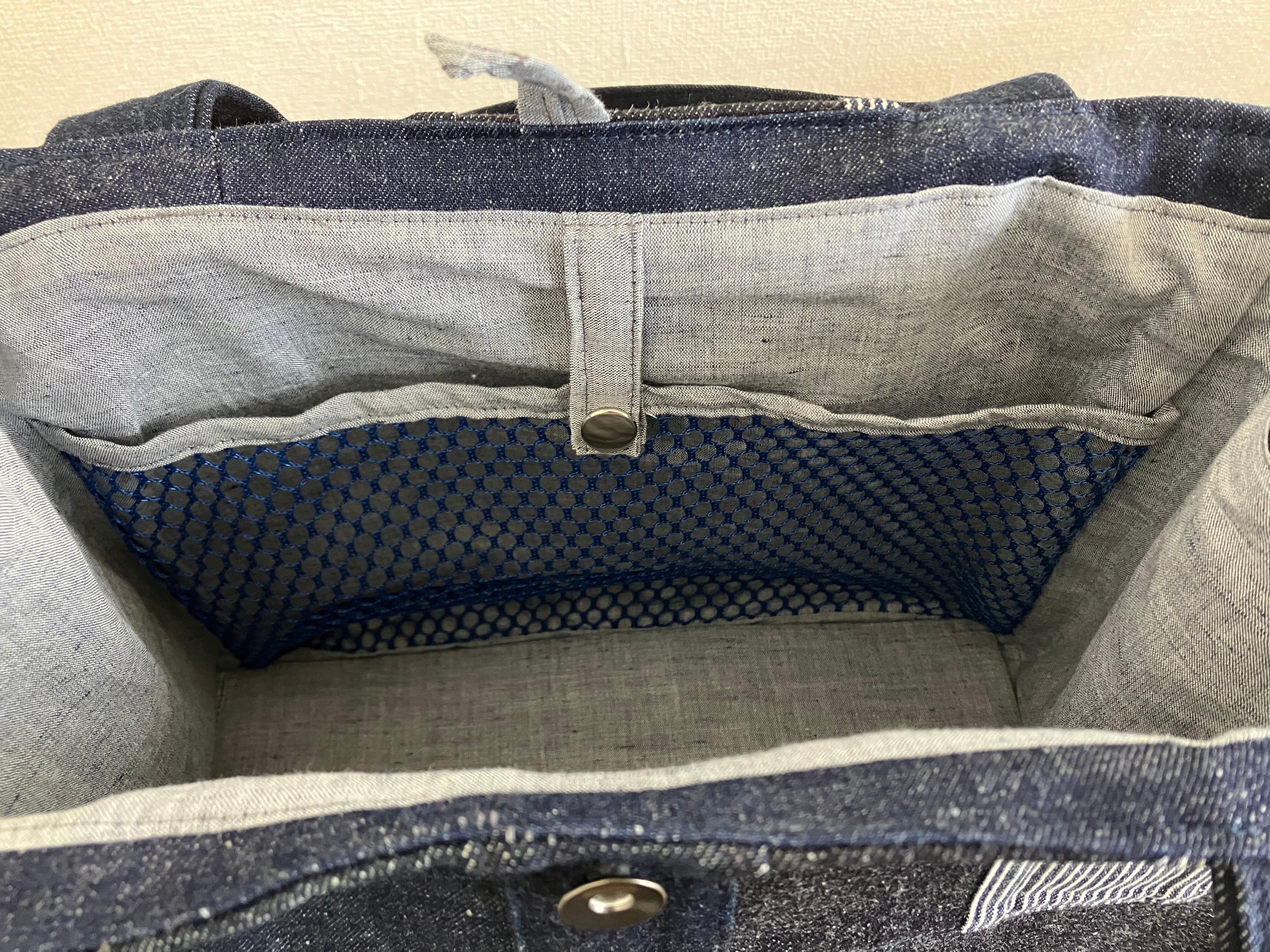 BLUEWORKSのトートバッグはサイドにジーンズのポケットが付いています。