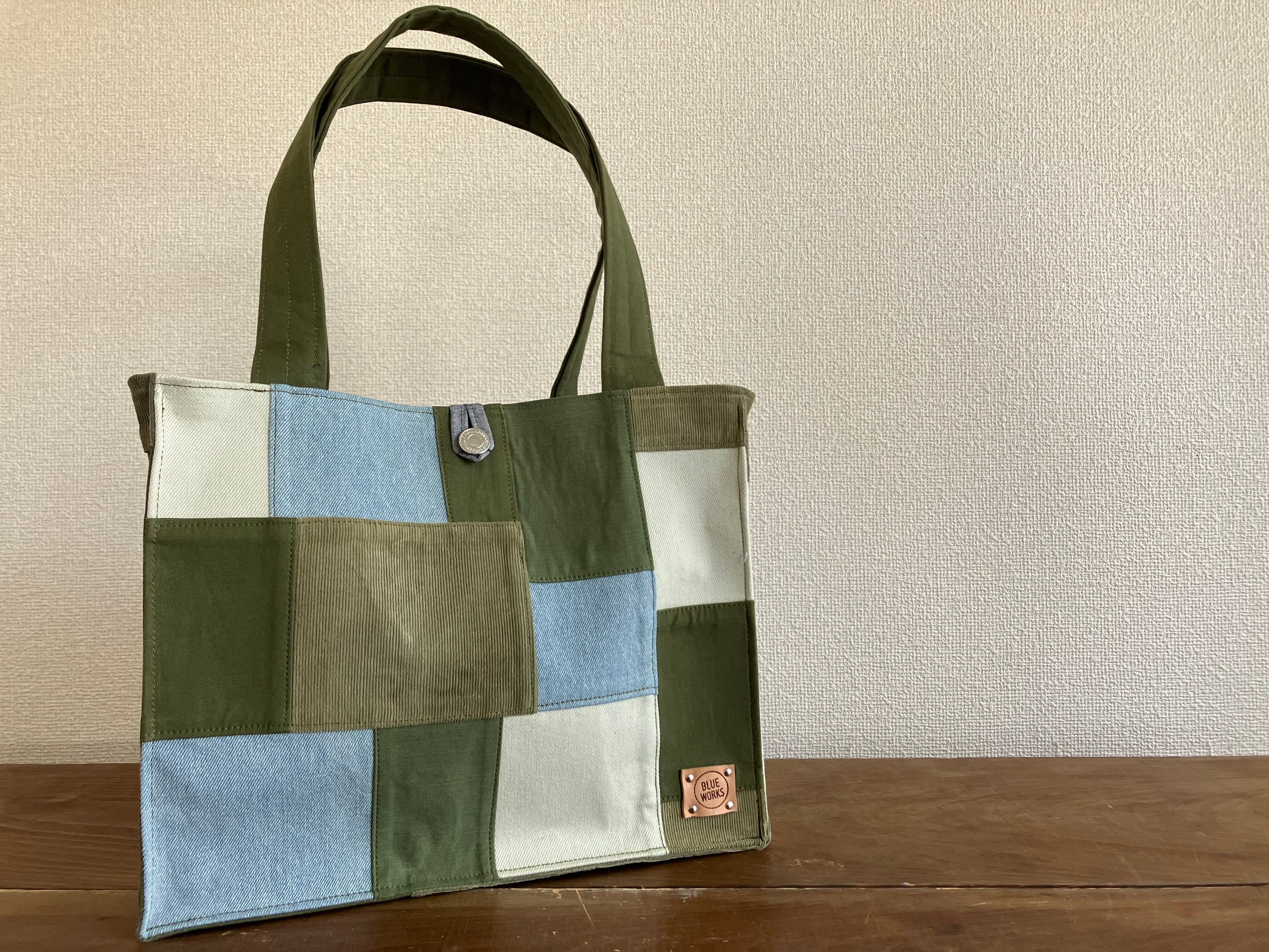 トートバッグ(M) グリーン×カーキ×ライトブルー