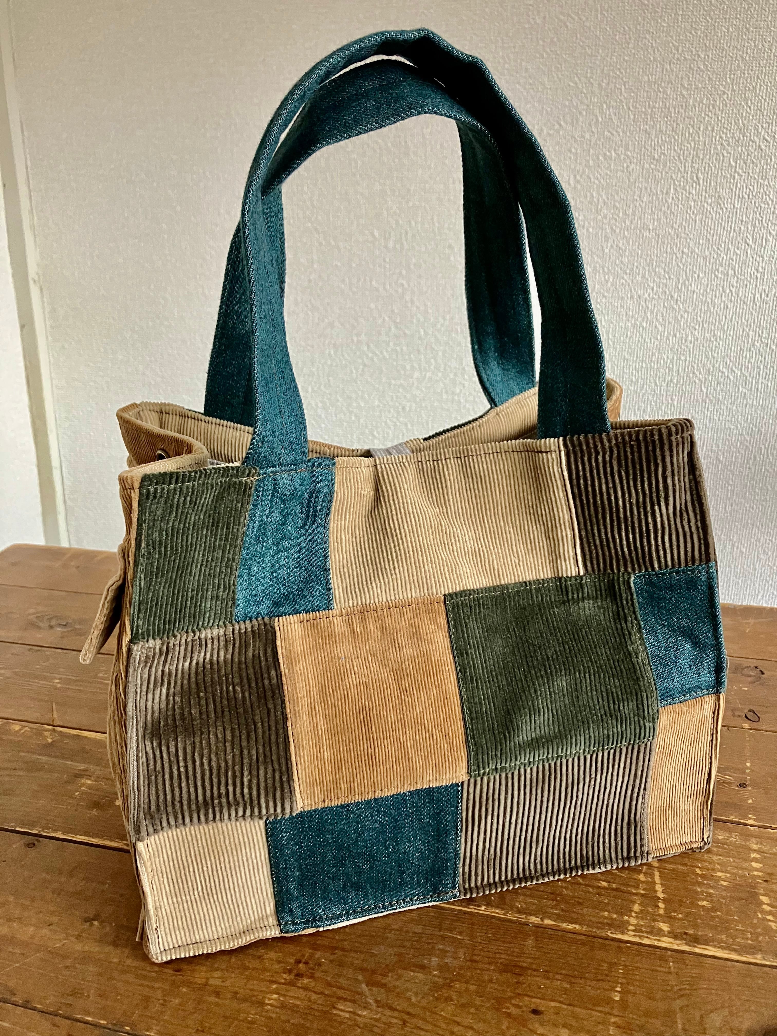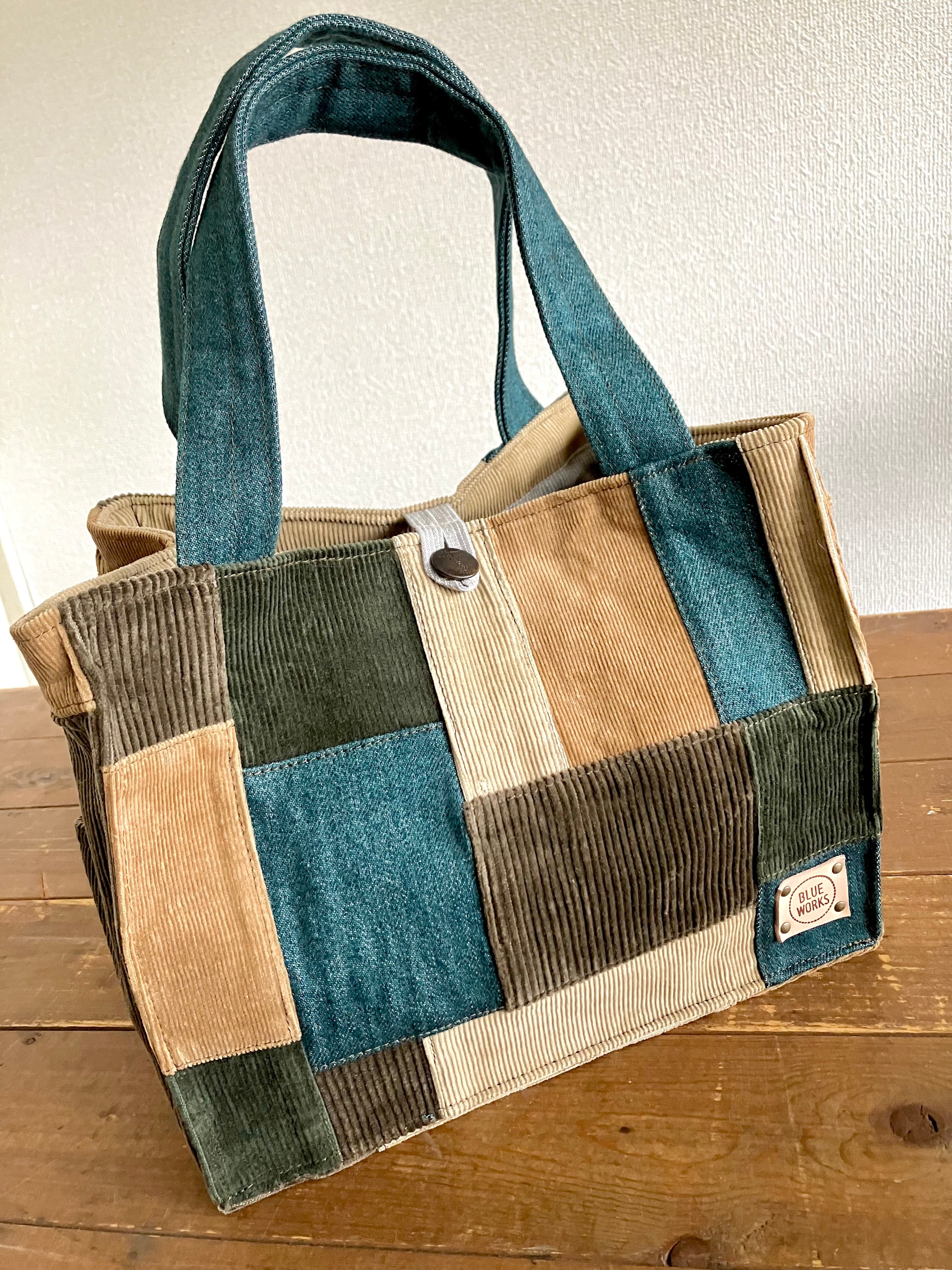 古着のデニムとコーデュロイパンツのアースカラーを5色パッチワークしました。