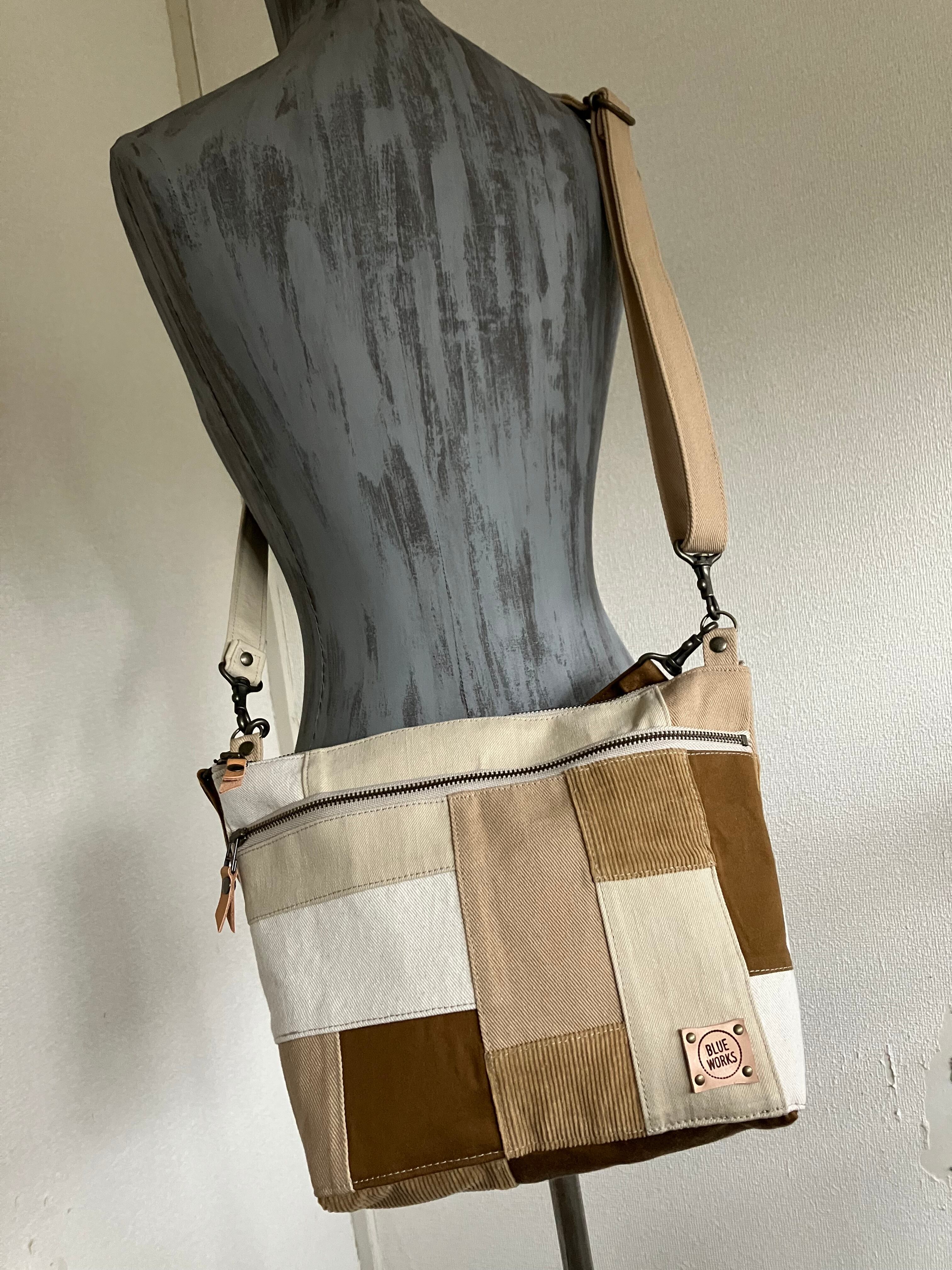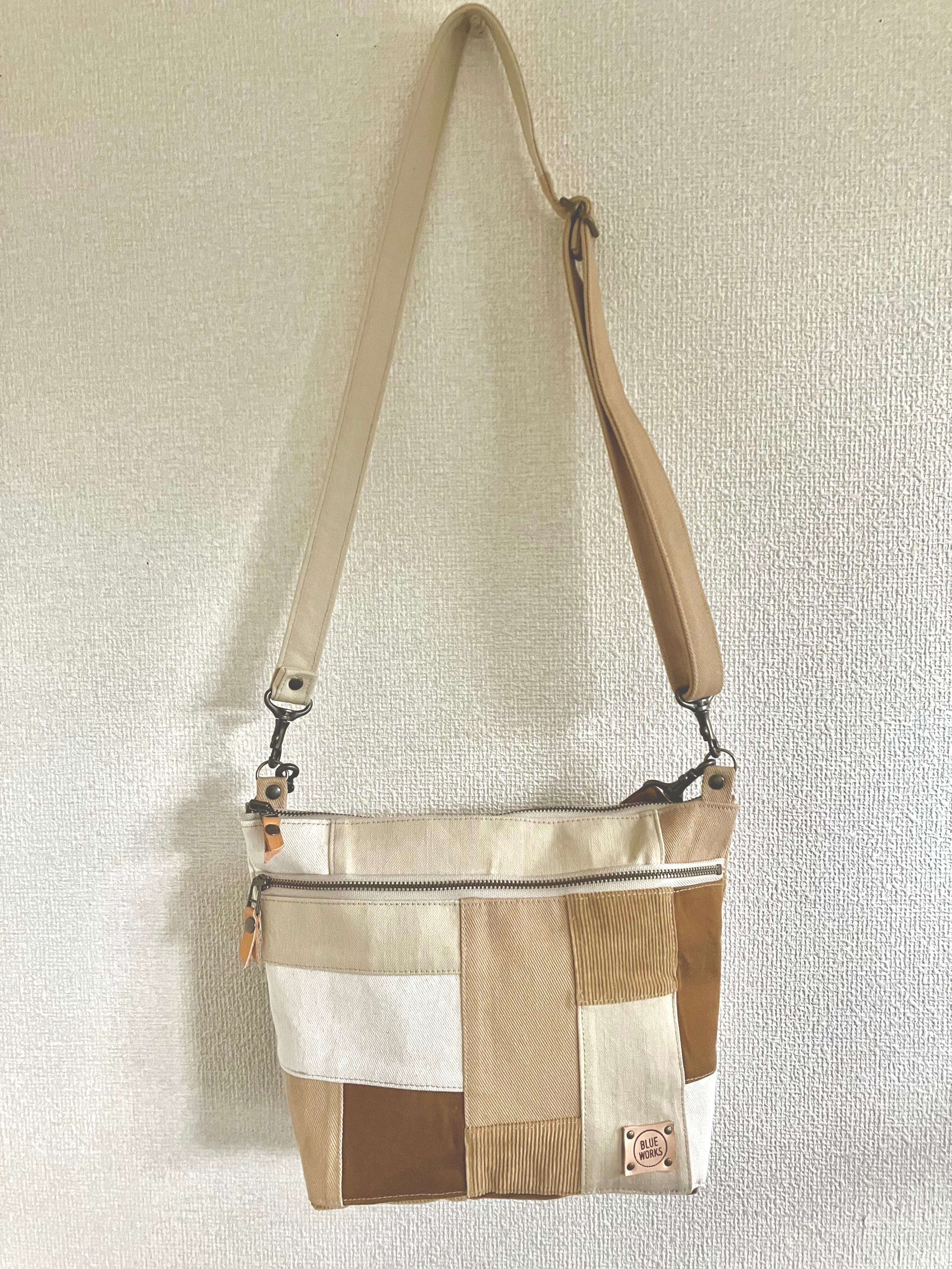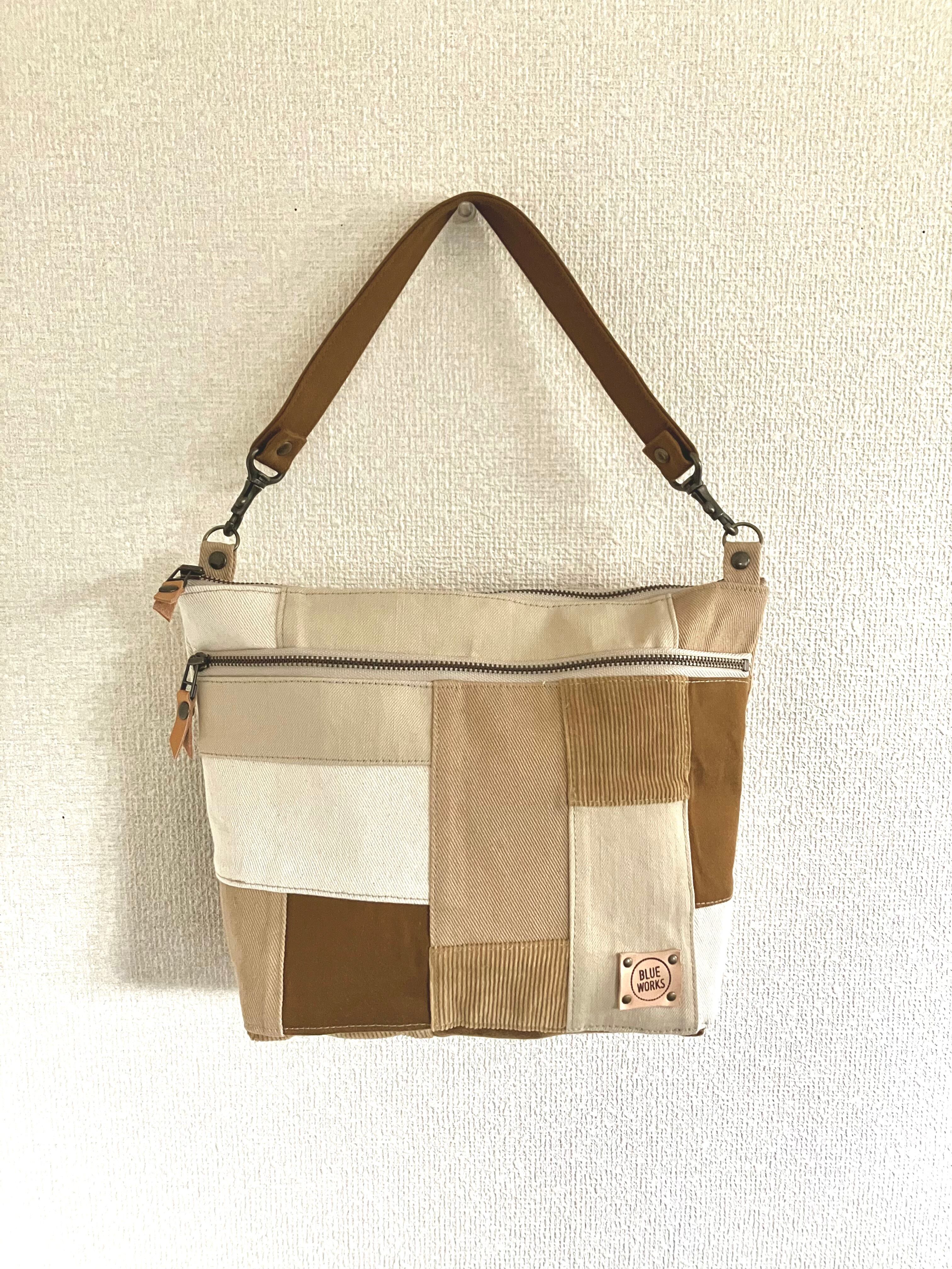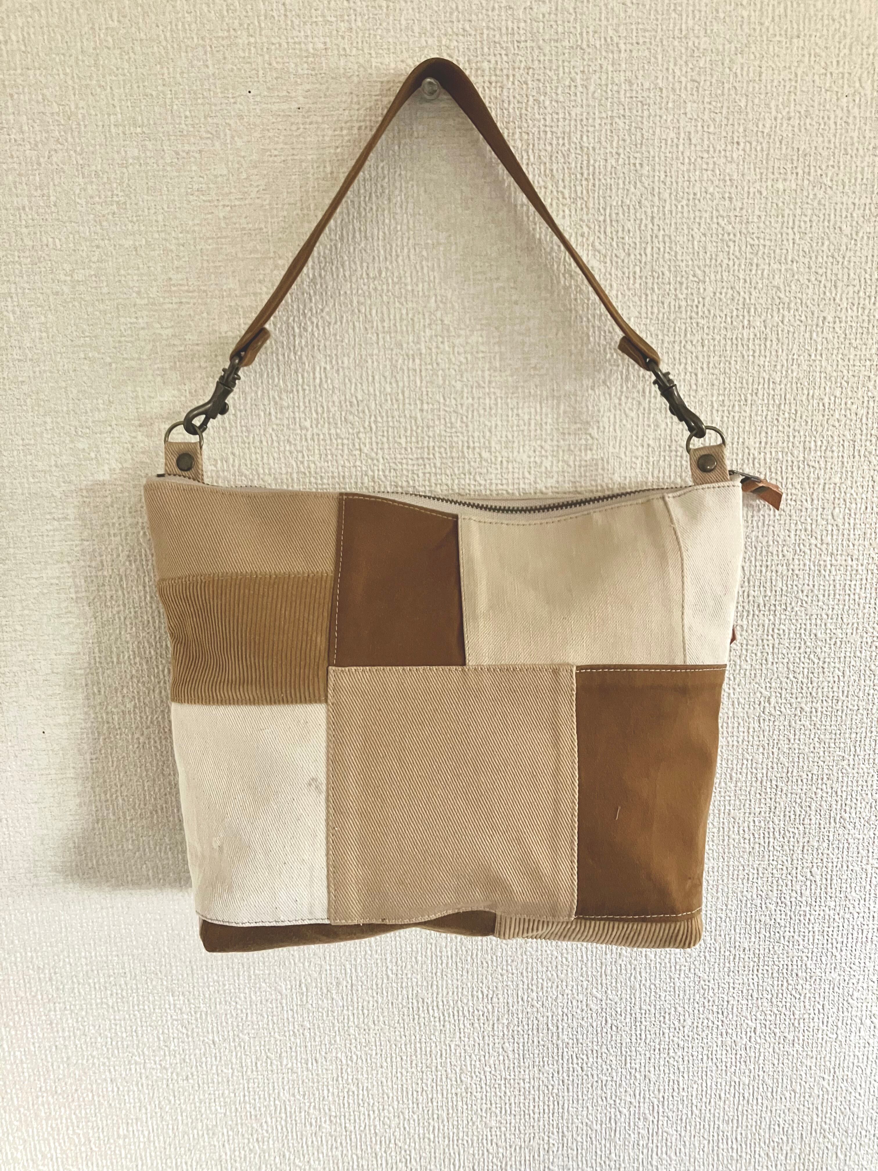 茶色、ベージュ、アイボリーの古着のデニムを5色パッチワークしました。