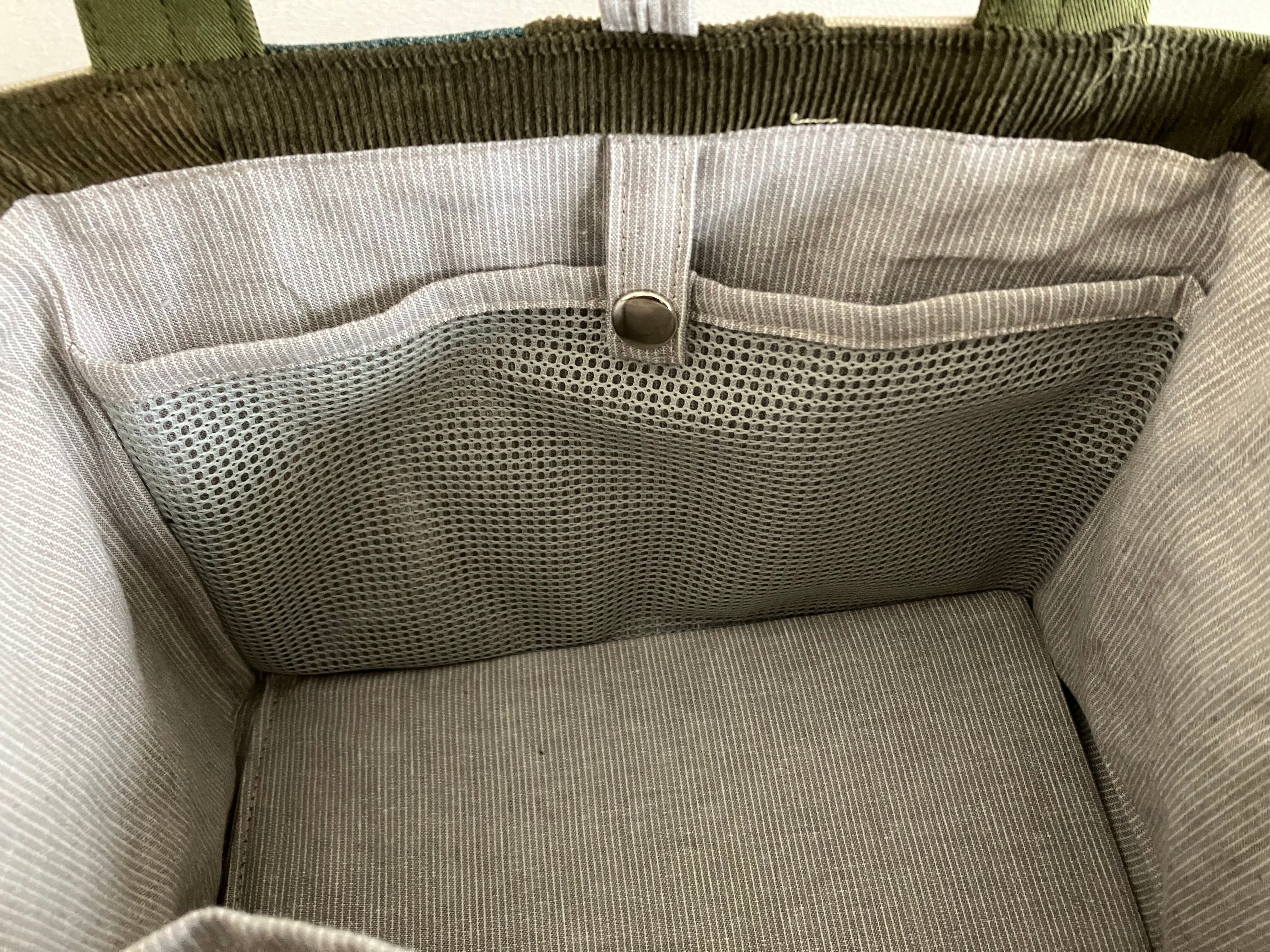 内側にはメッシュの大きなポケット、小分け用のポケットが付いていて使いやすさ抜群です。