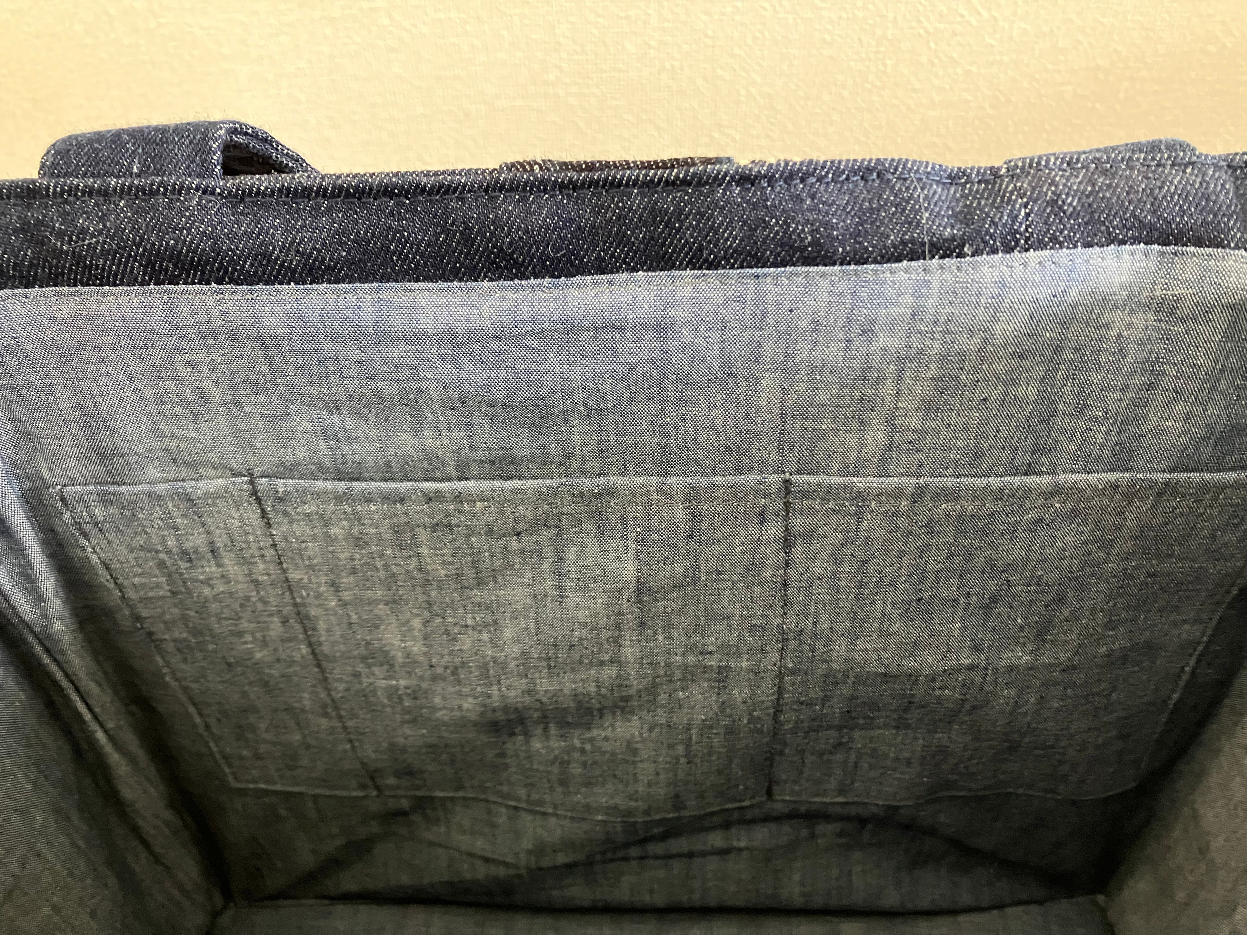 BLUEWORKSのトートバッグはサイドにジーンズのポケットが付いています。