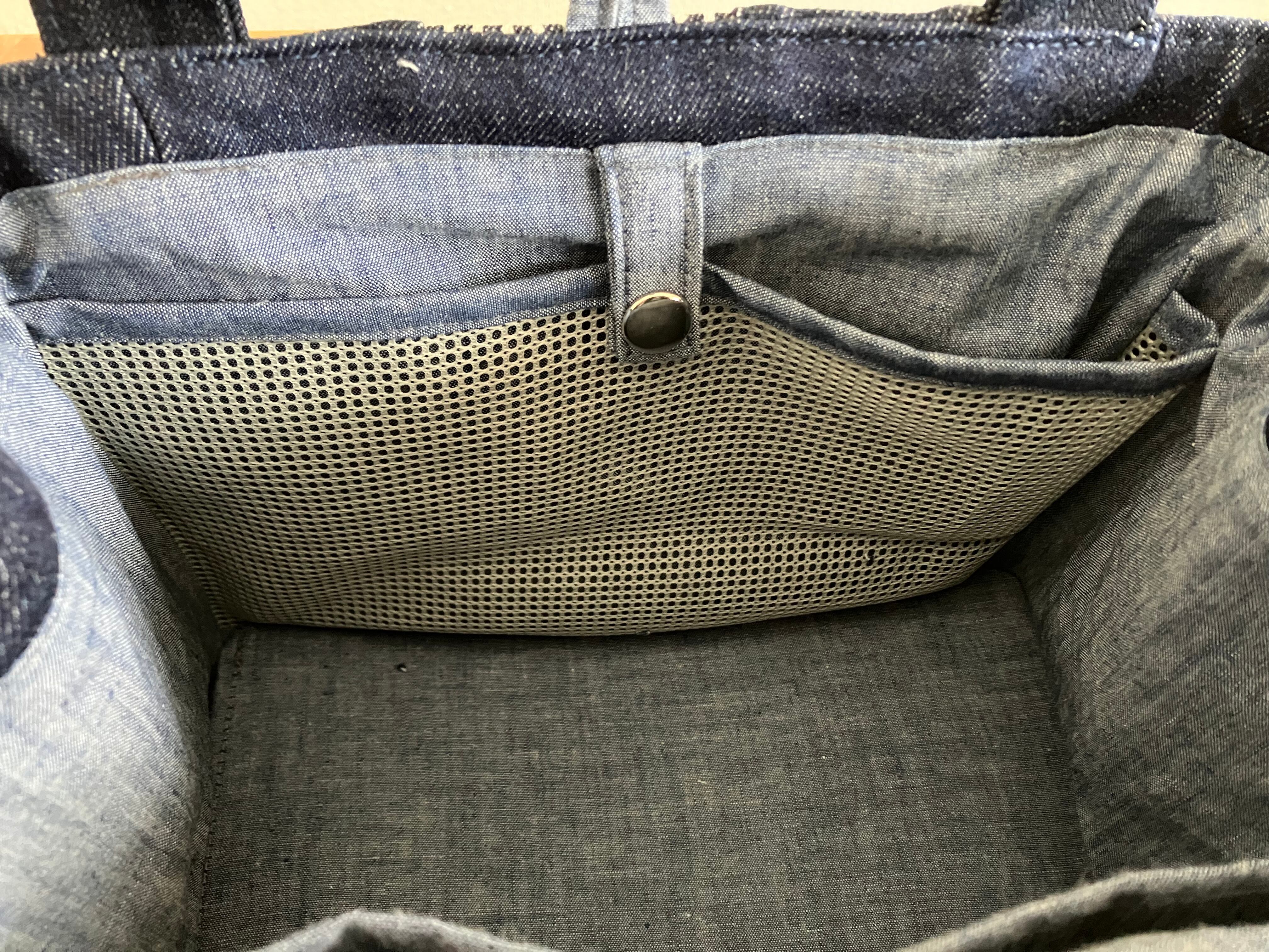 内側にはメッシュの大きなポケット、小分け用のポケットが付いていて使いやすさ抜群です。